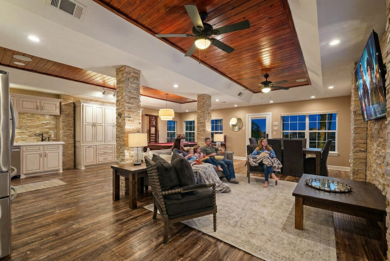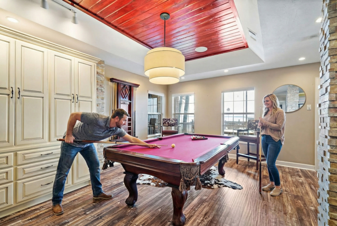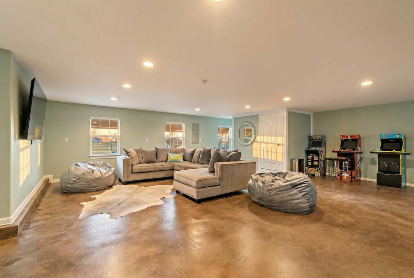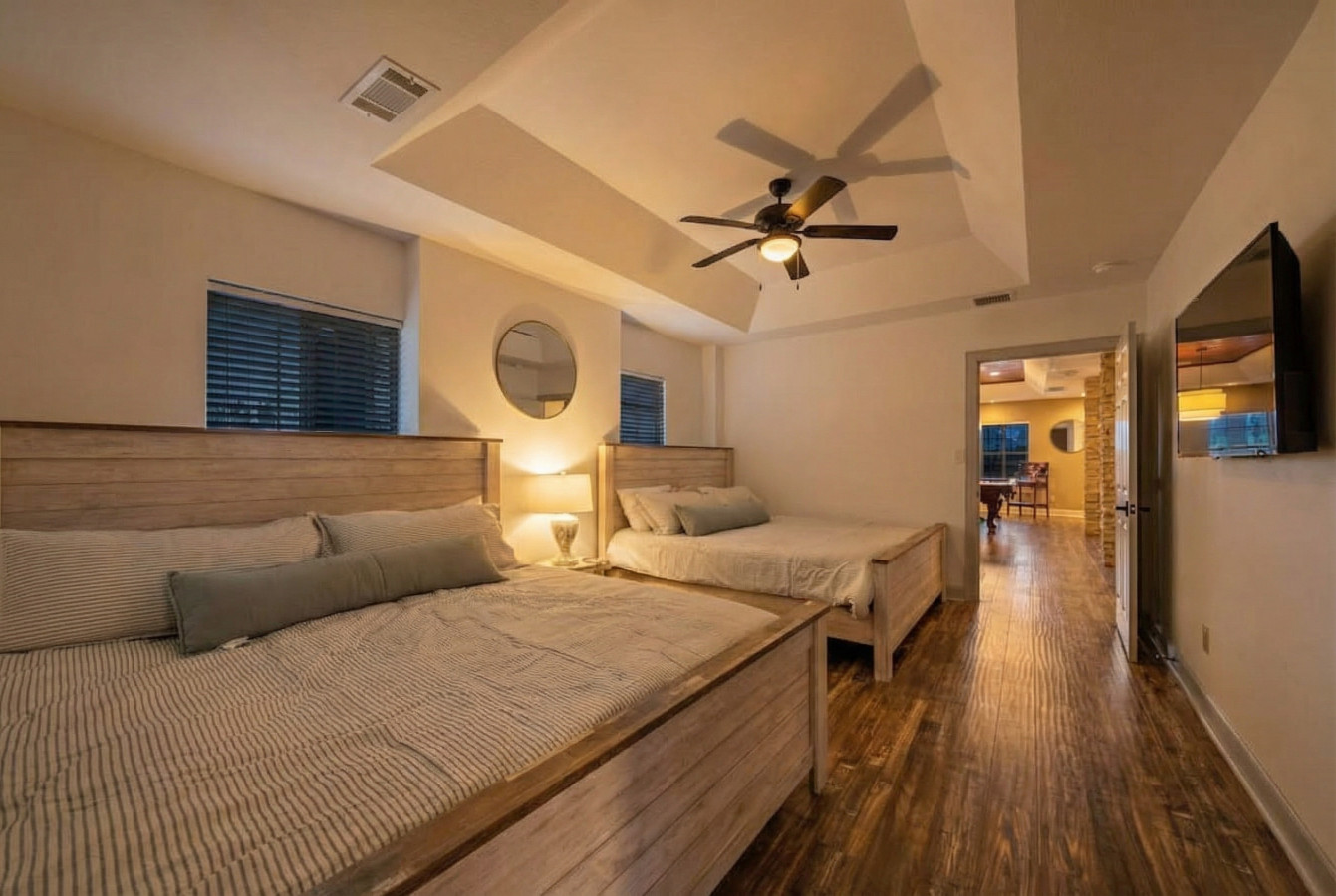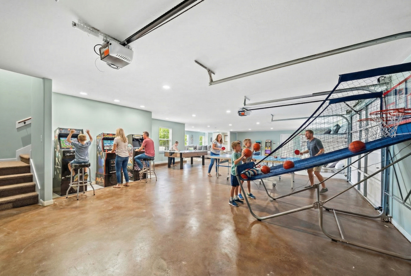 Head downstairs and discover a haven for entertainment! The massive game room boasts arcade games, ping pong, foosball, and a basketball court, all guaranteed to keep everyone entertained for hours. Movie nights are a breeze with the large flat-screen TV in this space. But wait, there’s more! This versatile room cleverly converts into a bedroom, offering 3 queen-over-full bunk beds and a full-size sofa bed.