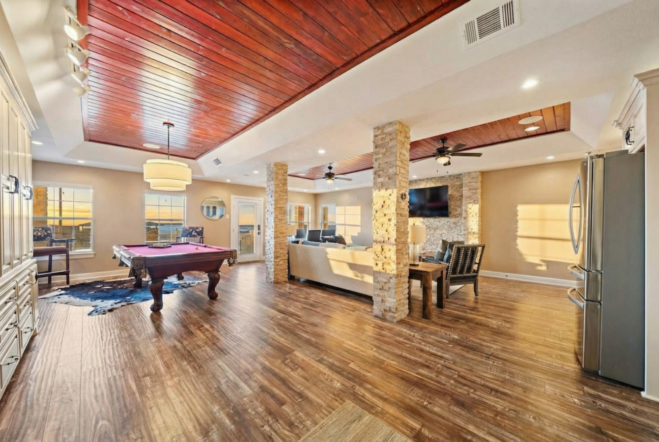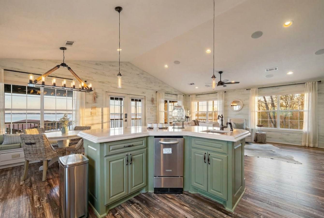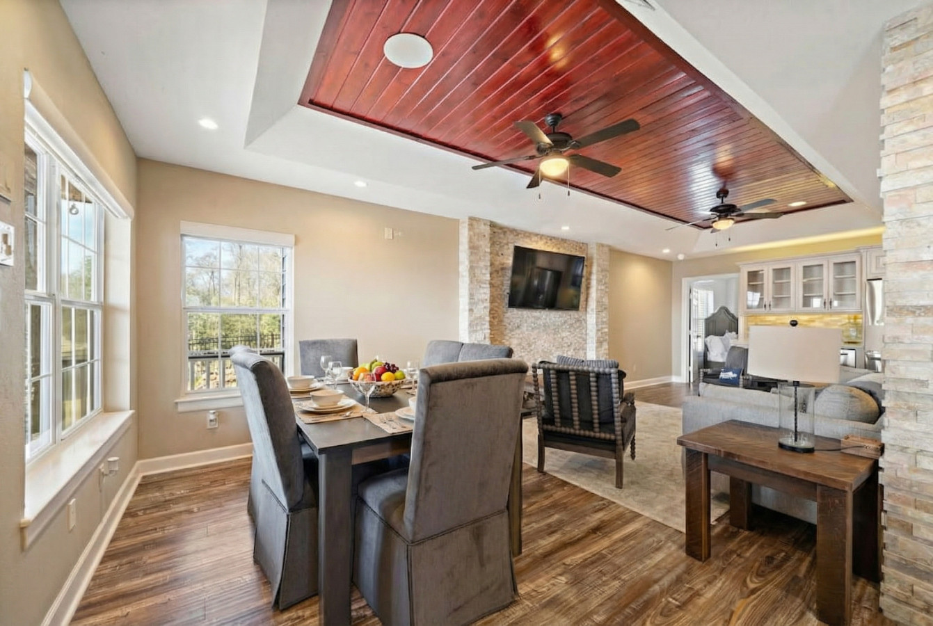 Imagine this: Spread out comfortably in this expansive property. The main living area, located on the second floor for maximized lake views, features an open-concept kitchen, dining room, and living room that flows seamlessly to a large patio. This level is also home to most of the sleeping quarters. As you walk down the hallway, there’s a queen room, a king room, another queen room, and a king room – all perfect for couples or individual travelers.