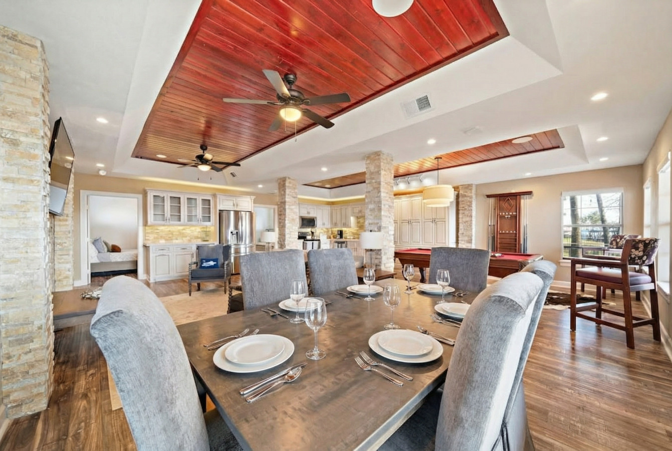 Calling all large families and groups! This stunning 12-bedroom retreat on the north shore of Lake Livingston offers the perfect escape for your next reunion or gathering. Relax and unwind on the private pier and boat dock, spend hours of fun in the massive game room, or simply soak up the sun by the sparkling new pool!! The pool can be heated as well!!