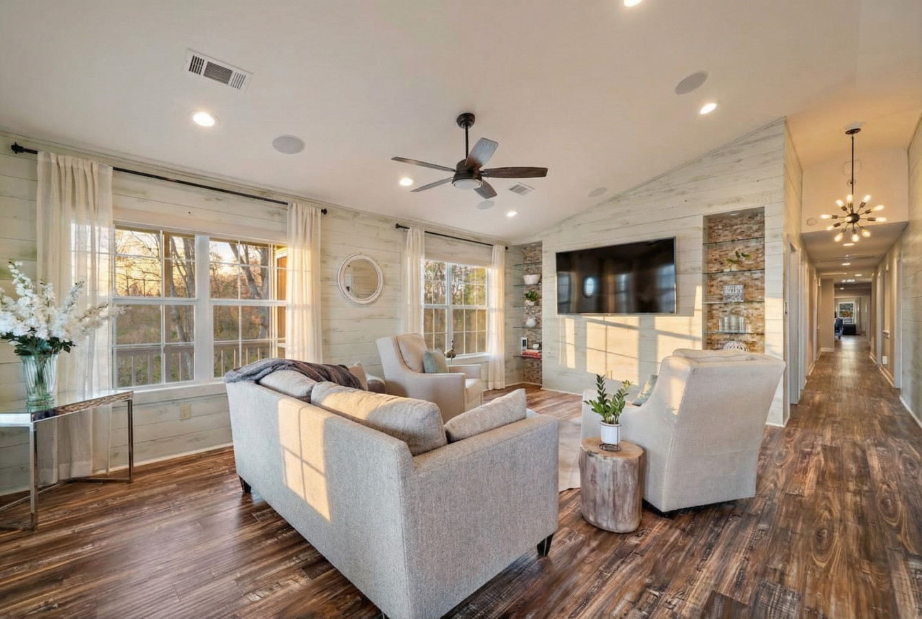 Next, you’ll find a room with 2 queen beds, ideal for families or friends. A smaller room with a twin bunk bed is tucked away at the end of the hallway, offering a cozy spot for younger guests. Finally, the crown jewel of the main floor is a luxurious king suite with a private sitting area, ensuite bathroom, and a twin bed with a matching trundle for additional sleeping space. This suite is located at the far end of the main floor, offering a bit of privacy.