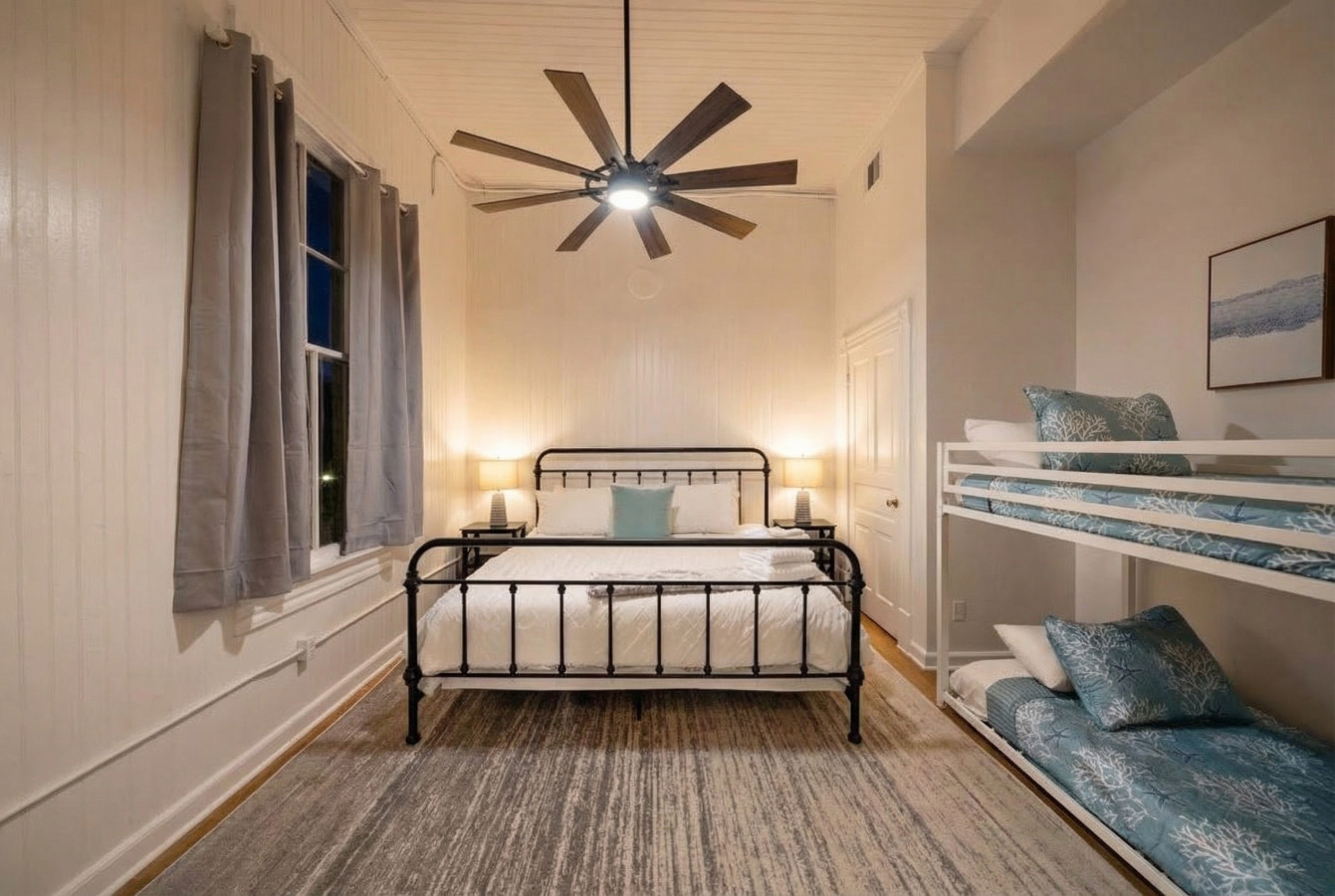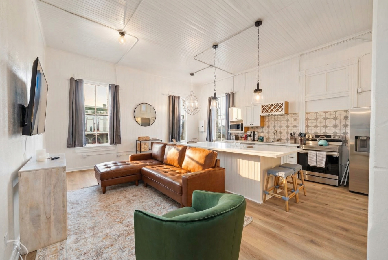 Welcome to Market Street Loft C, a delightful vintage gem with lofted ceilings, loads of natural light, and a beautifully renovated kitchen. The bedroom features a king size bed and twin/twin bunk bed. A second twin/twin bunk bed is nestled off the main living space. Enjoy al fresco dining on the large balcony overlooking downtown. Whether you’re looking to spend time on The Strand, the beach, or a quick overnight before a cruise departure, this loft is the perfect home base for your trip. This is a historic building with early 20th century building materials and single-pane windows. Noise may be present.