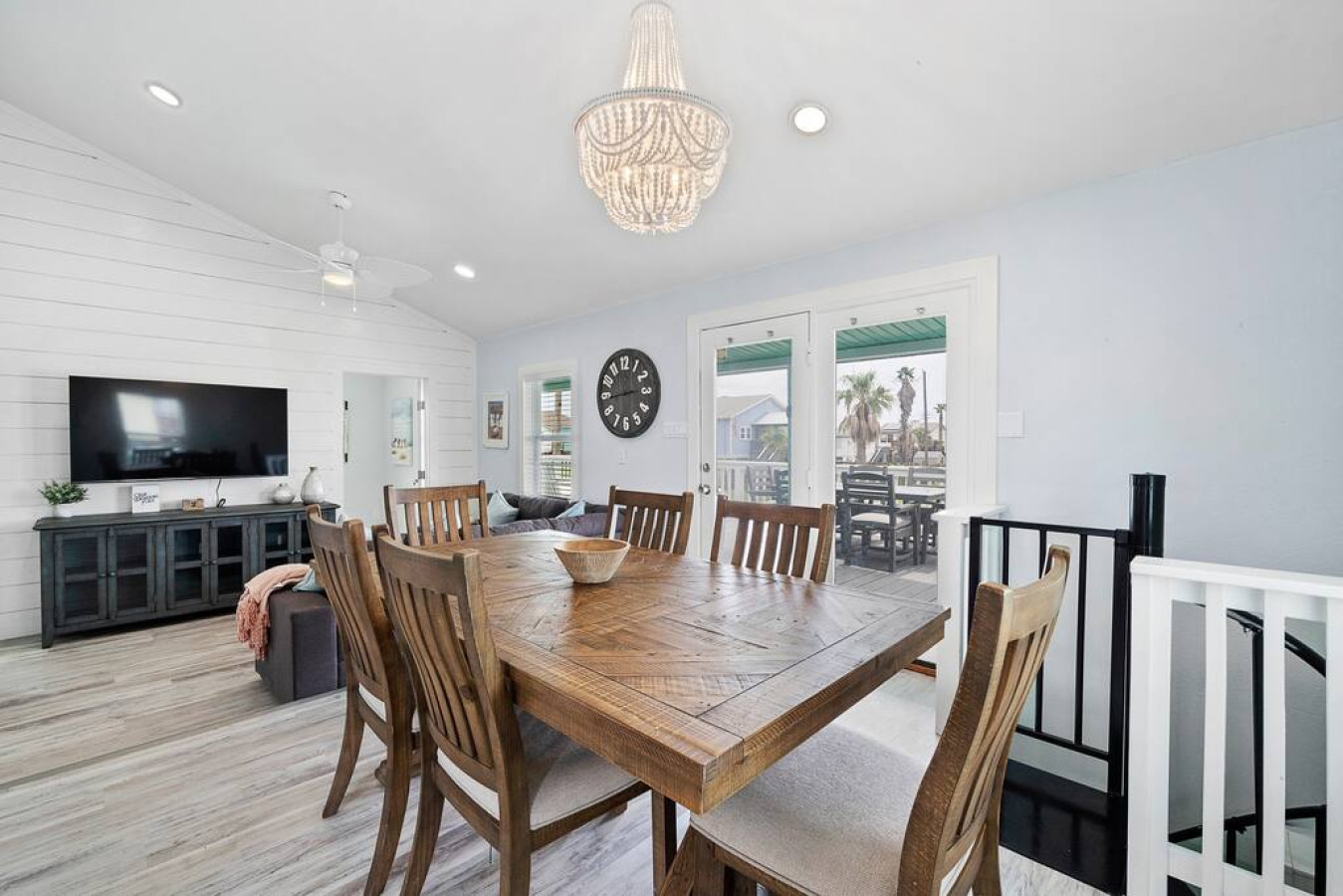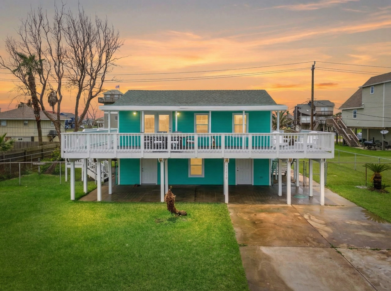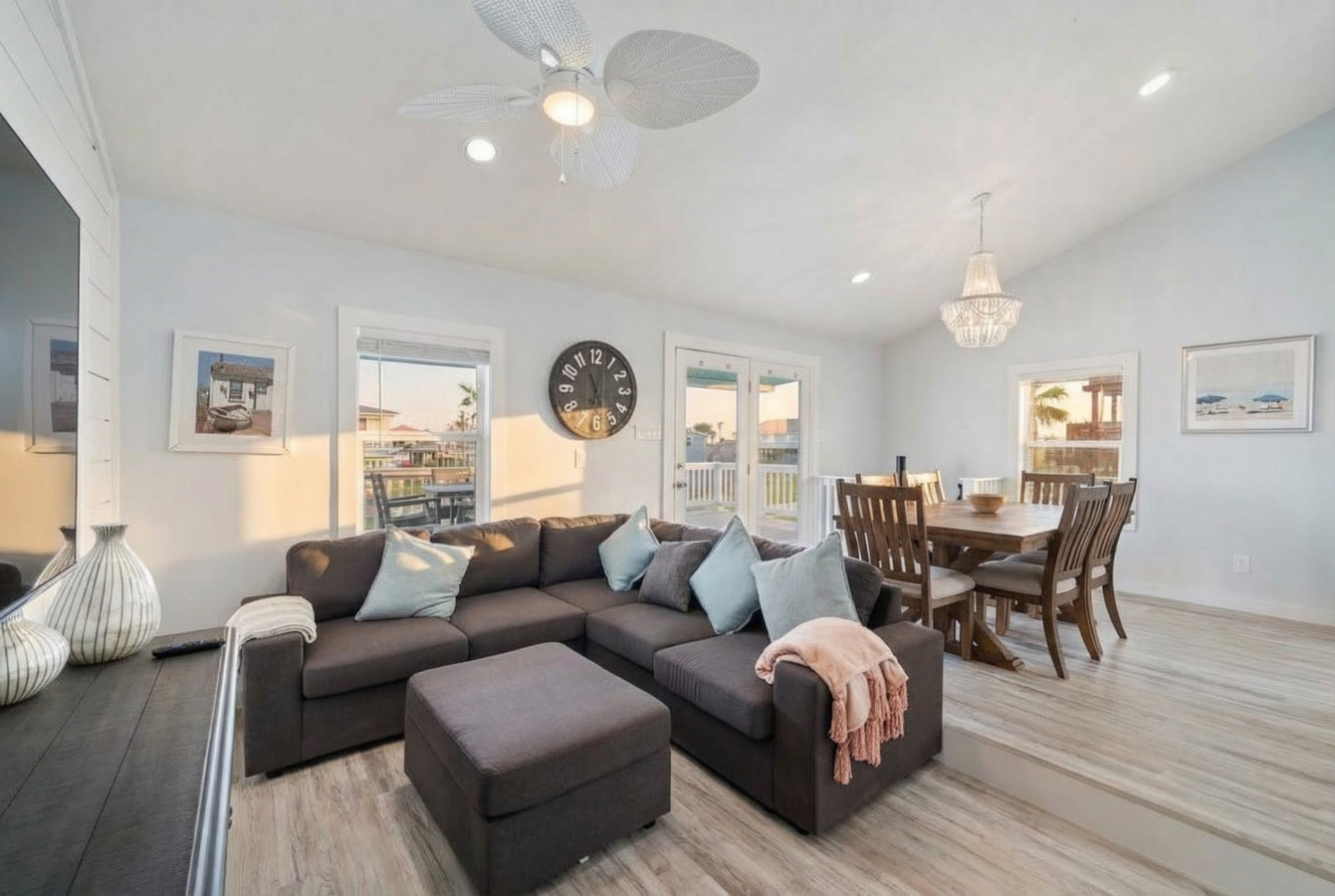 “ This sign is displayed in the living room and encompasses the vibe of this beach house. There is ample room to entertain 2 parental units upstairs; with a nice kitchen to cook and huge wooden table, to converse, while the kids enjoy their own private space downstairs; with 2 bedrooms & enough beds for all of them. A cute, secret spiral staircase will connect them to mom & the food upstairs. The backyard is fenced in for safety & the wrap around deck will give the parents plenty of eyes on the kids, as they frolic in the cowboy pool, after going to Jamaica Beach, which is less than a 1/2 mile away. I came for just a visit, but next time I’ll stay to play! ”