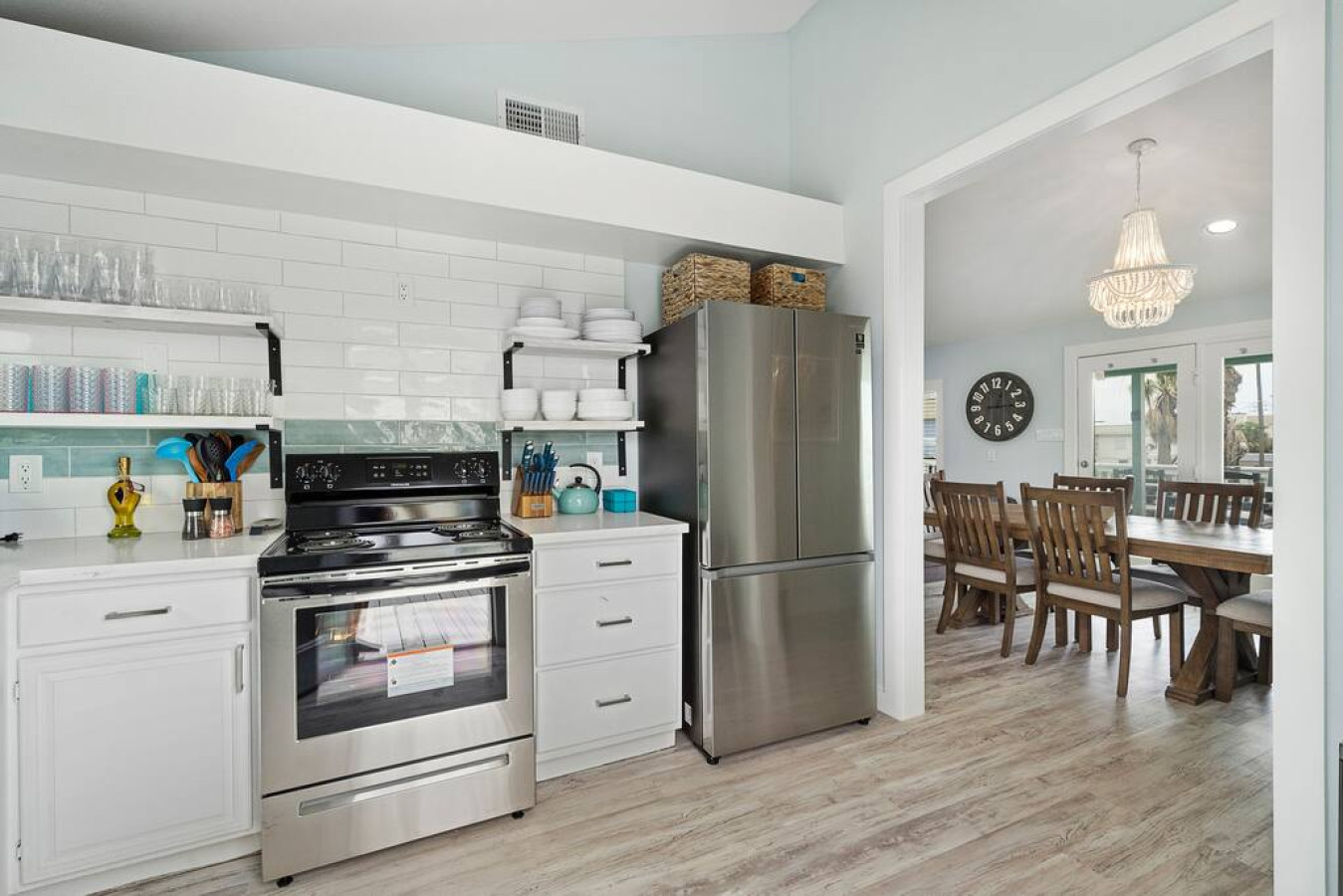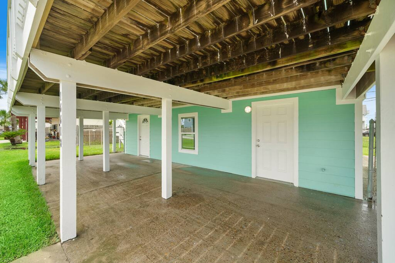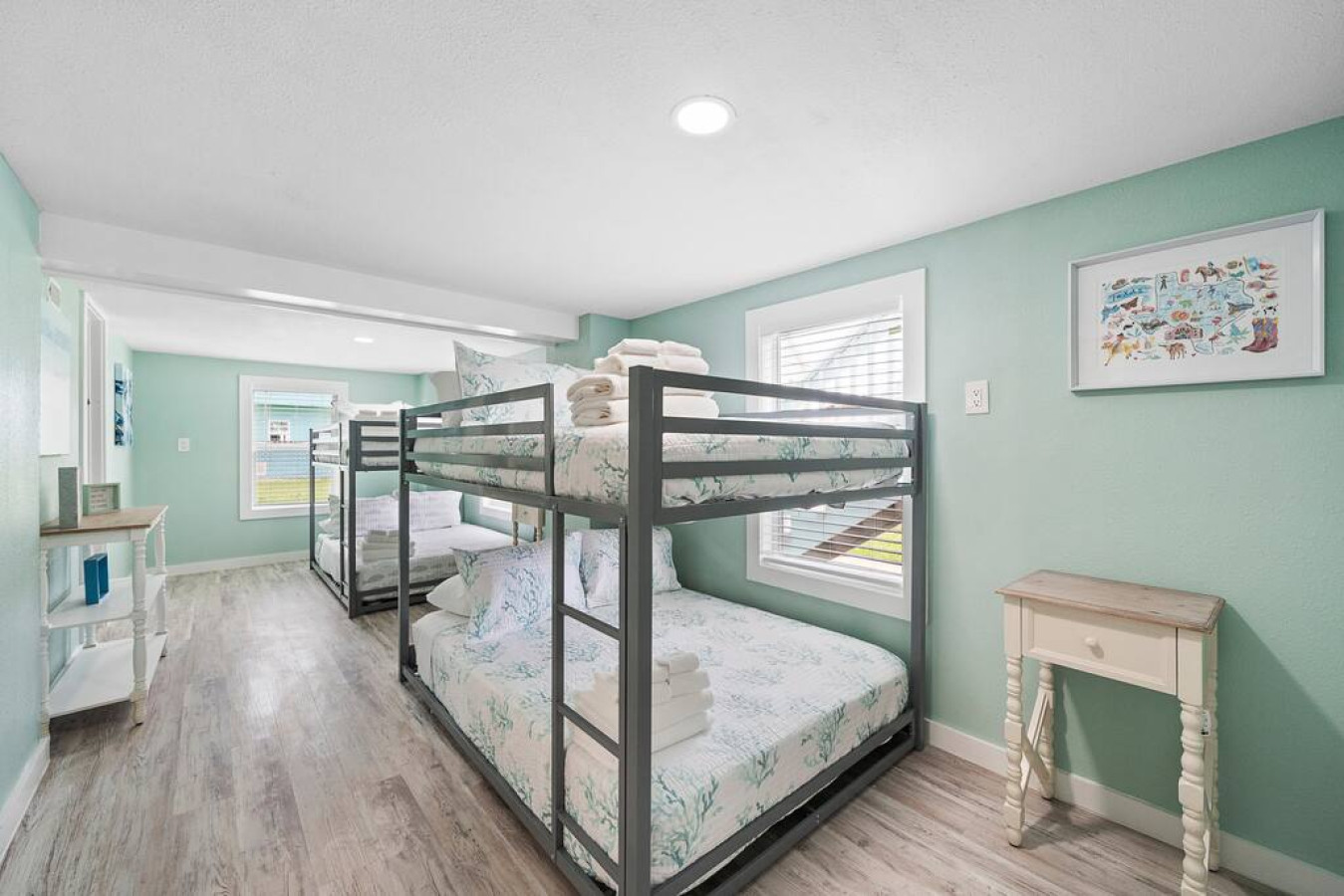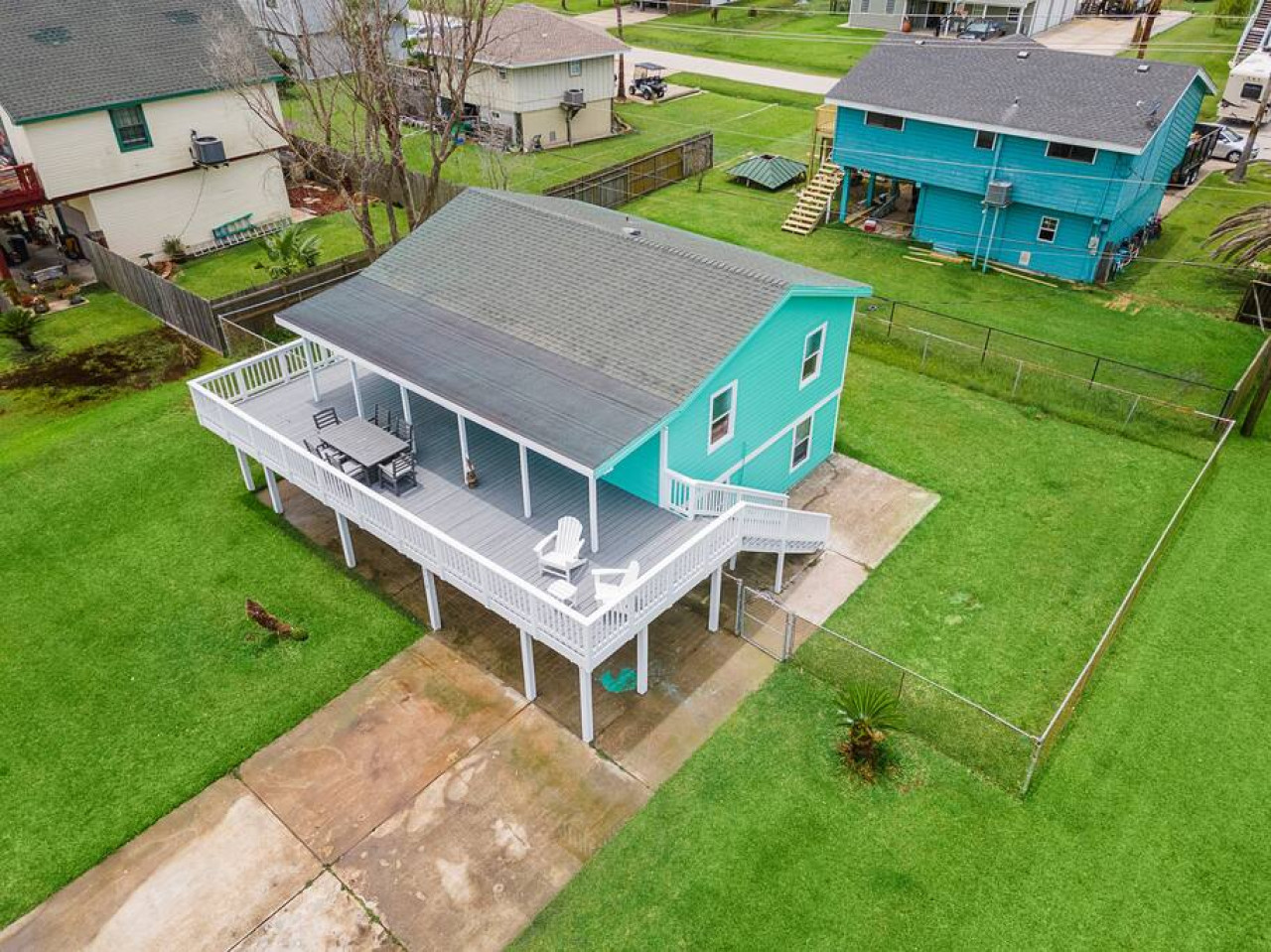 “ This sign is displayed in the living room and encompasses the vibe of this beach house. There is ample room to entertain 2 parental units upstairs; with a nice kitchen to cook and huge wooden table, to converse, while the kids enjoy their own private space downstairs; with 2 bedrooms & enough beds for all of them. A cute, secret spiral staircase will connect them to mom & the food upstairs. The backyard is fenced in for safety & the wrap around deck will give the parents plenty of eyes on the kids, as they frolic in the cowboy pool, after going to Jamaica Beach, which is less than a 1/2 mile away. I came for just a visit, but next time I’ll stay to play! ”