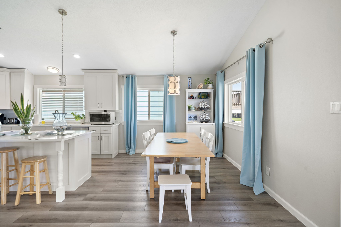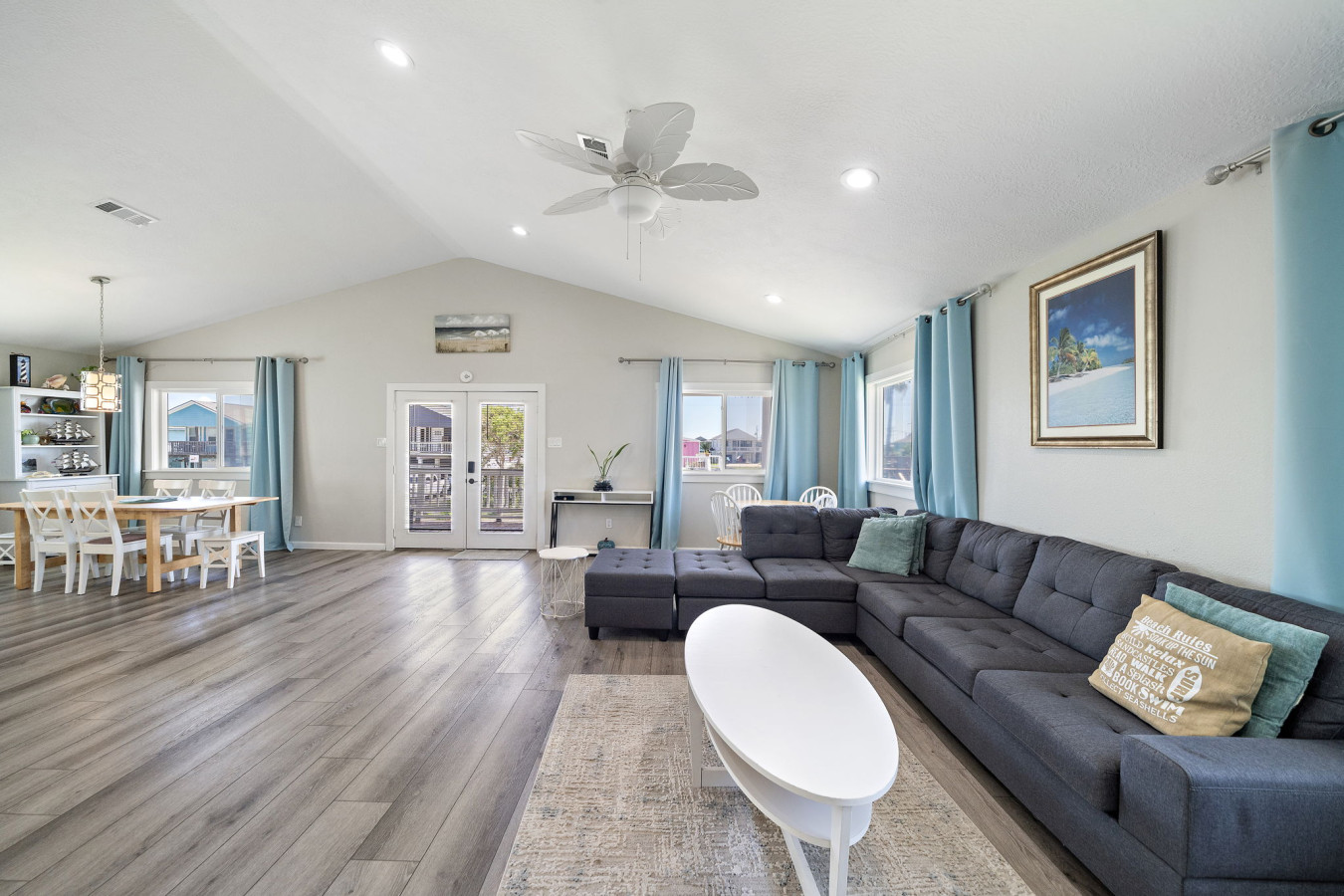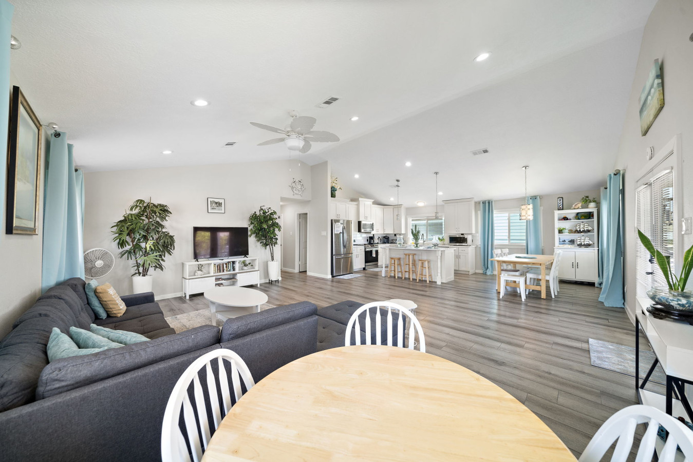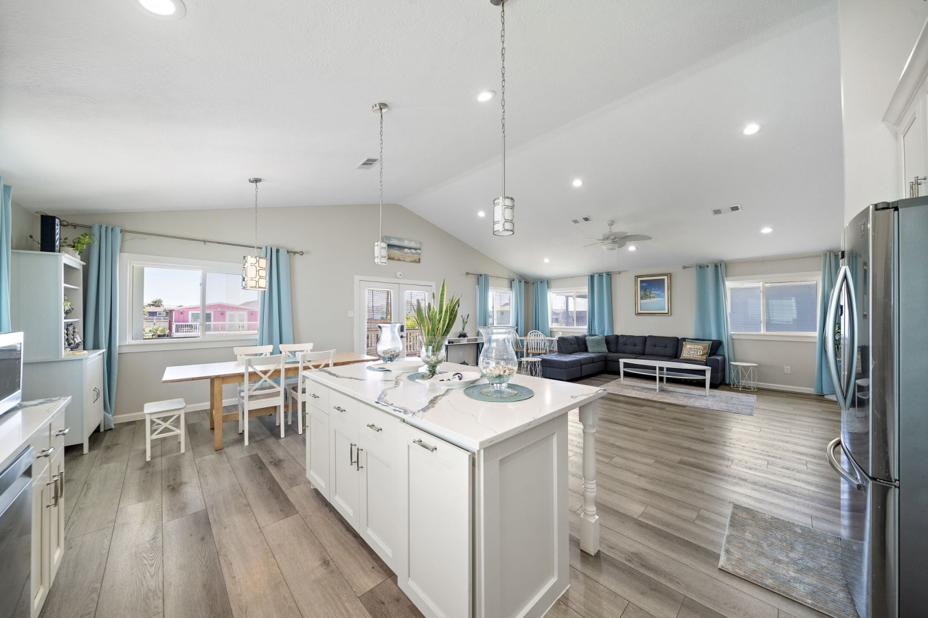 Walk into the main level open space living area with cozy living room, dining area, and fully stocked kitchen. A sectional sofa invites you to relax after a day of fun, whether it’s reading a book, watching a movie on the large flat-screen TV, or simply taking a nap. The open kitchen boasts ample counter space and modern appliances, making meal prep a breeze. Whether you’re packing snacks for the beach, grabbing takeout from a local restaurant, or whipping up a family feast, the kitchen has everything you need. A breakfast bar with seating allows for casual meals or catching up with loved ones over appetizers while the dining table allows for a more formal family meal.