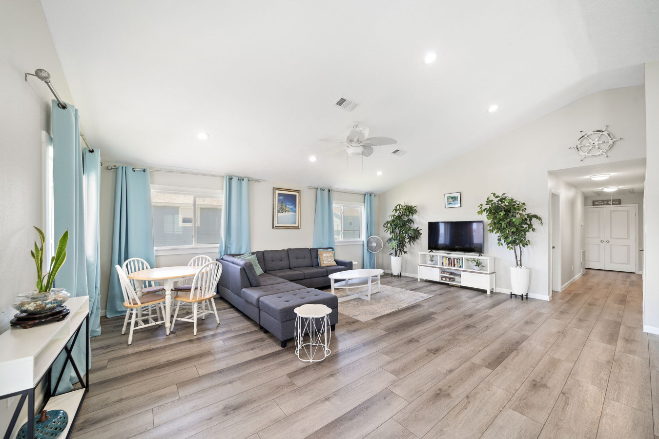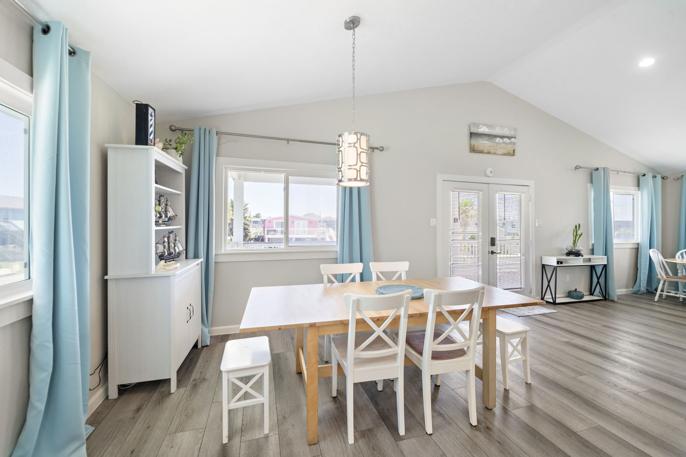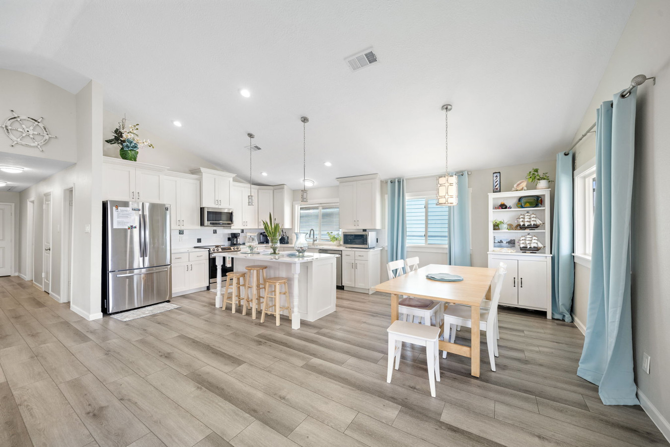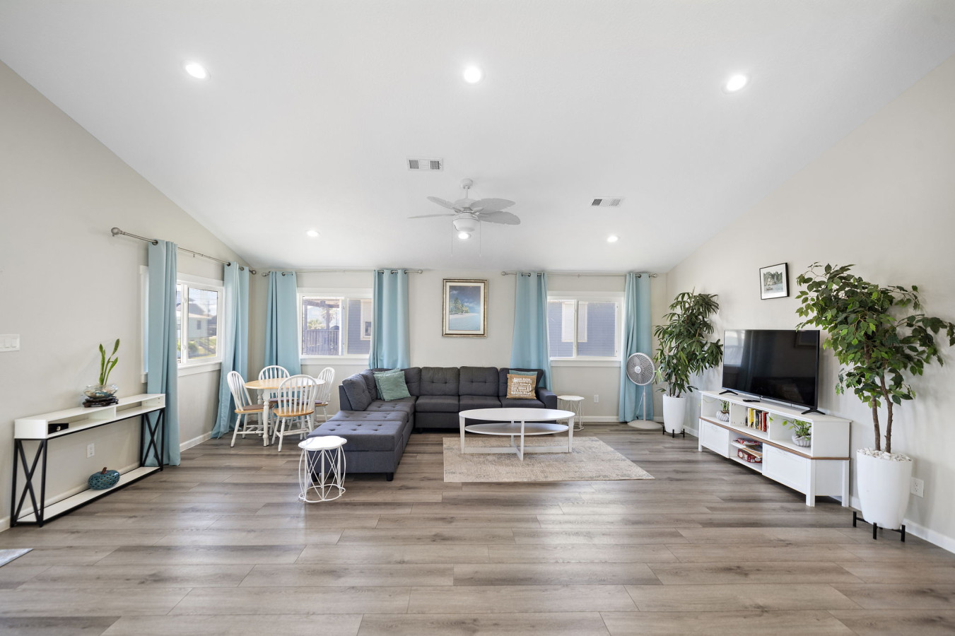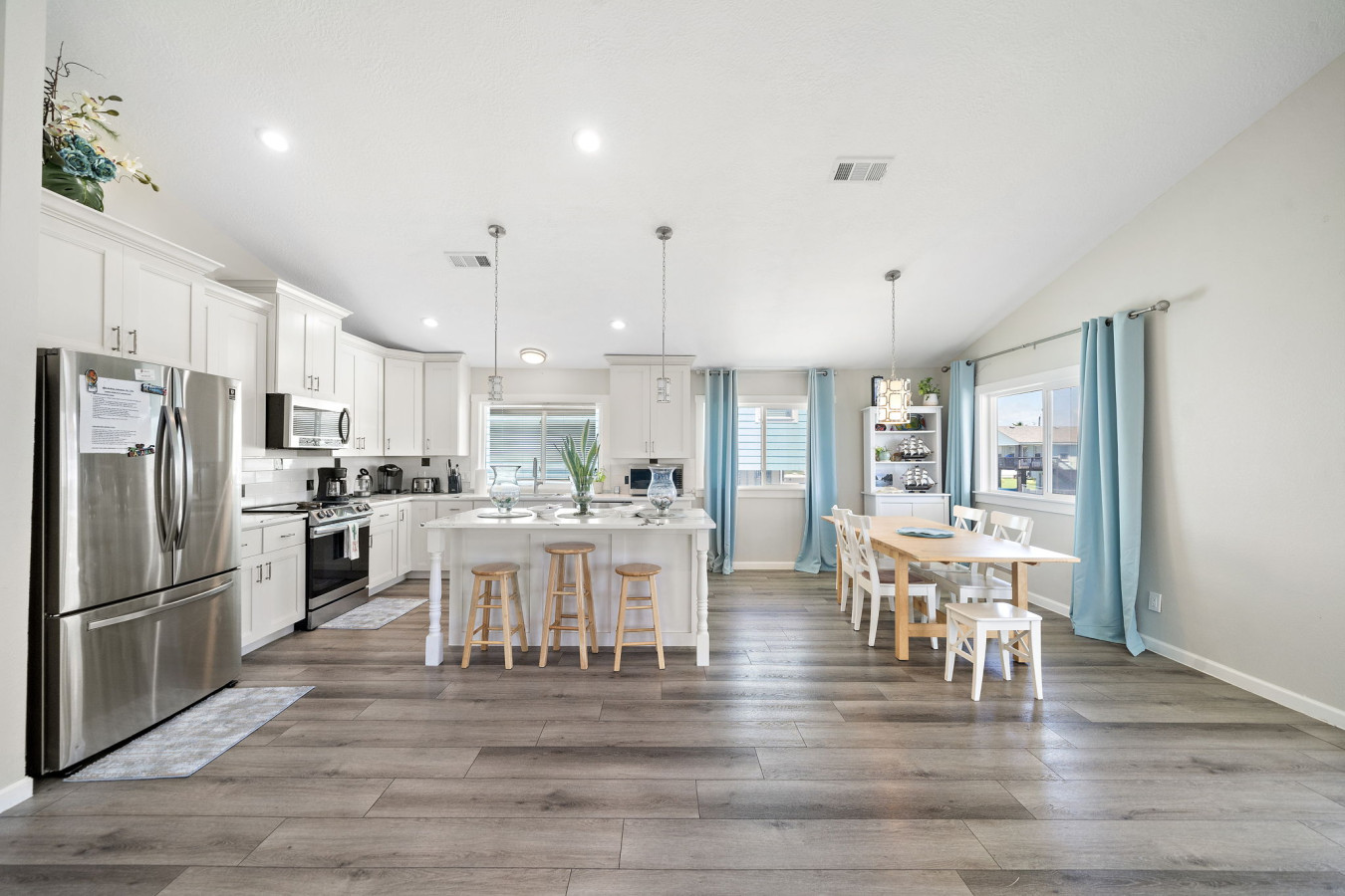 Walk into the main level open space living area with cozy living room, dining area, and fully stocked kitchen. A sectional sofa invites you to relax after a day of fun, whether it’s reading a book, watching a movie on the large flat-screen TV, or simply taking a nap. The open kitchen boasts ample counter space and modern appliances, making meal prep a breeze. Whether you’re packing snacks for the beach, grabbing takeout from a local restaurant, or whipping up a family feast, the kitchen has everything you need. A breakfast bar with seating allows for casual meals or catching up with loved ones over appetizers while the dining table allows for a more formal family meal.