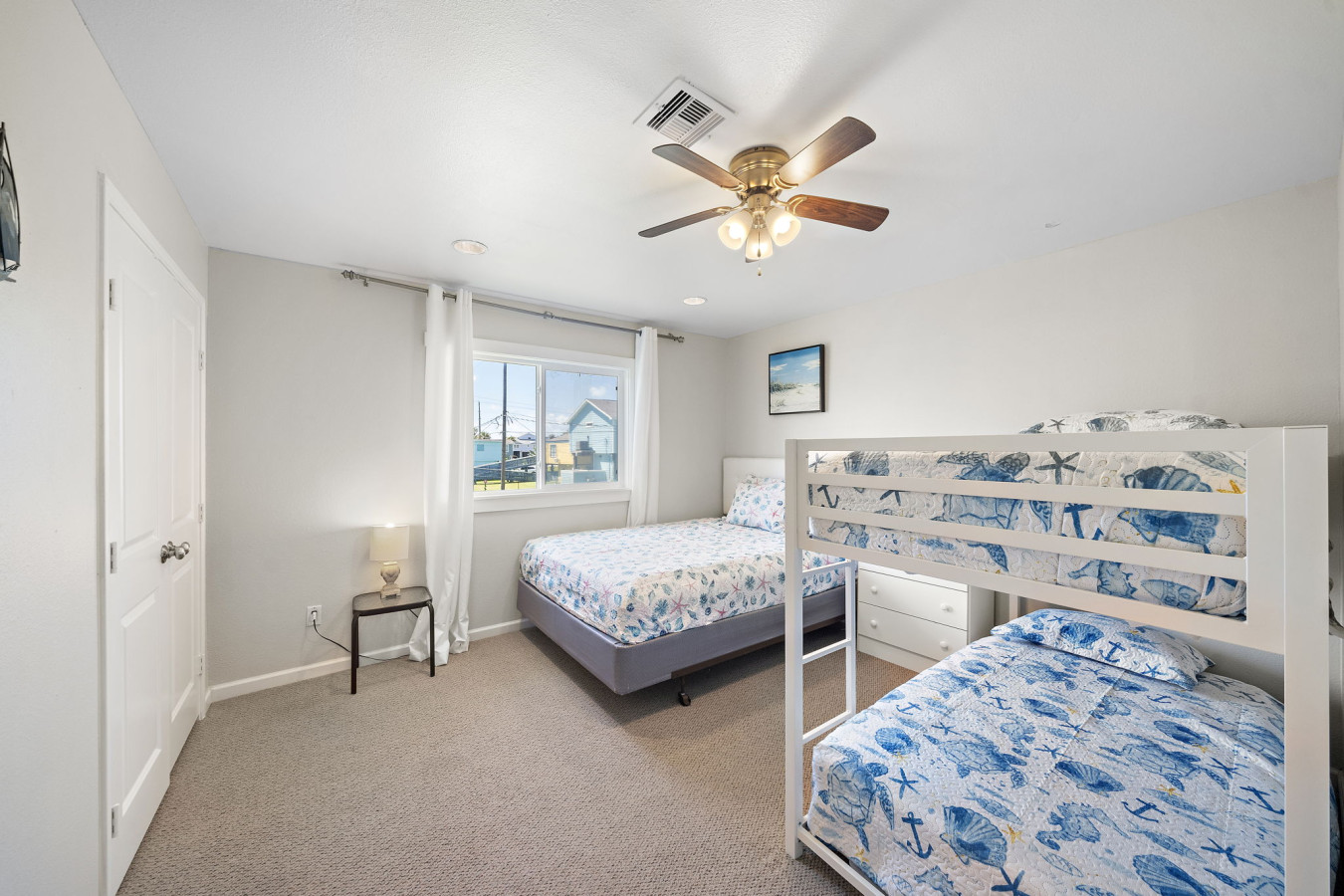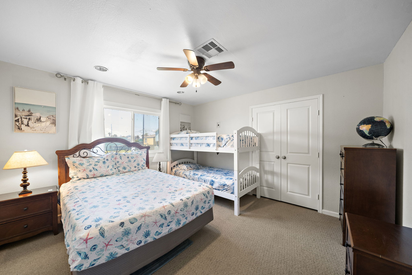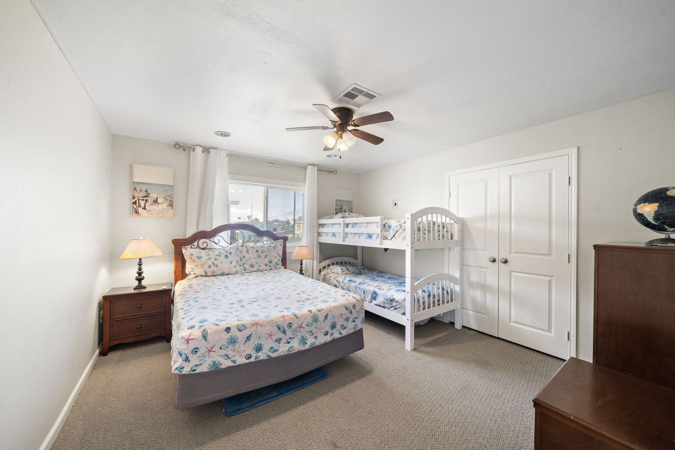 The master bedroom offers a serene escape with a queen-size bed. An en-suite bathroom provides a relaxing spot with a tub/shower combination. There is a second bedroom with a comfortable queen-size bed and a twin-over-twin bunk bed, while the third bedroom on this floor functions well for families. It is equipped with a full-size bed and another twin-over-twin bunk bed. A hallway on the main floor provides access to a full bathroom and a laundry closet.