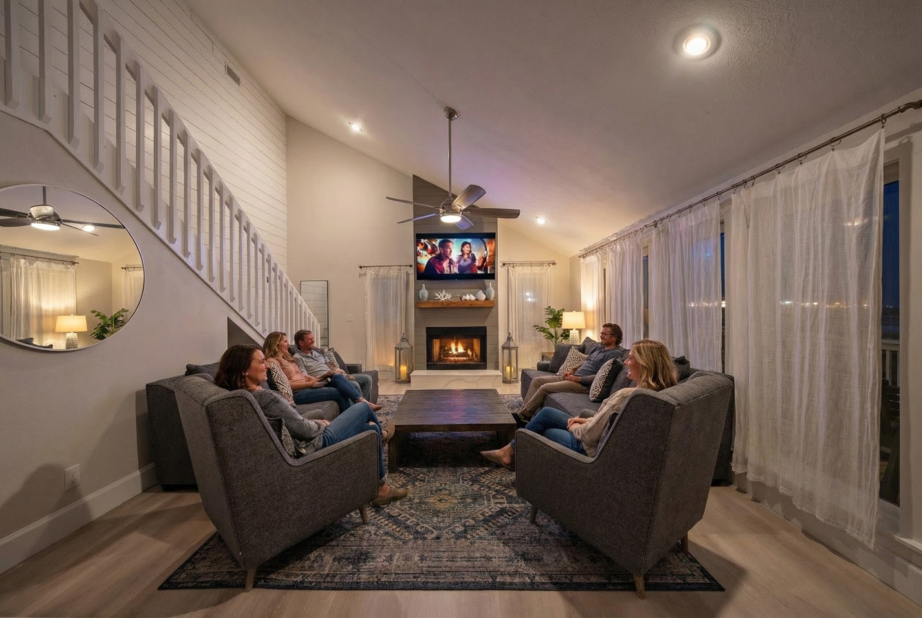 The main level great room welcomes you with soaring vaulted ceilings and a wall of windows facing the ocean. Two comfortable sofas and two armchairs surround a modern wood coffee table. Over the fireplace is a 65-inch flatscreen television. Your whole crew will love to kick back here in the evenings and watch the game, or maybe compete in a friendly family game night. There’s plenty of space for everyone to chill.