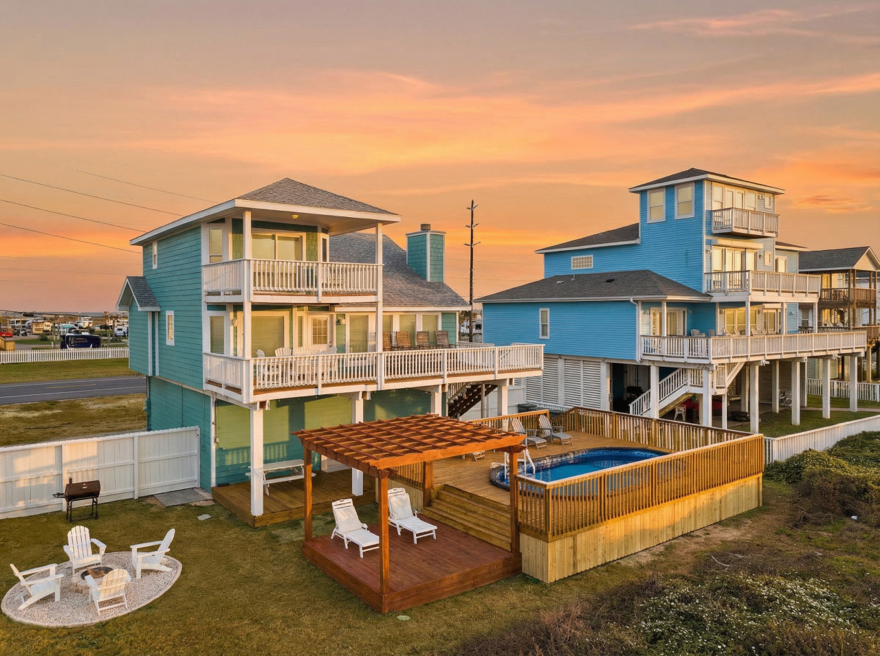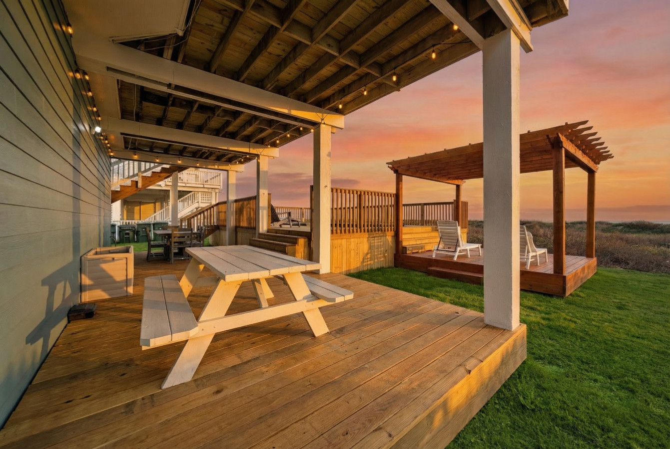 When your crew is ready to soak up the Texas sunshine, simply step outside— the beach is your backyard. Hang out in the pool and work on your tan in one of the lounge chairs. Grab a quick snack at the outdoor dining table. Head down to the oceanside pergola for an afternoon siesta in the shade. Take a stroll down your private boardwalk and straight onto the beach. At Seaside Serenity, it’s all at your fingertips and right outside your door. Plus, the energy and excitement of the Galveston Strand is a short drive away. For the magical oceanfront vacay to the Texas Gulf Coast you’ve been daydreaming about, Seaside Serenity is where it all begins.