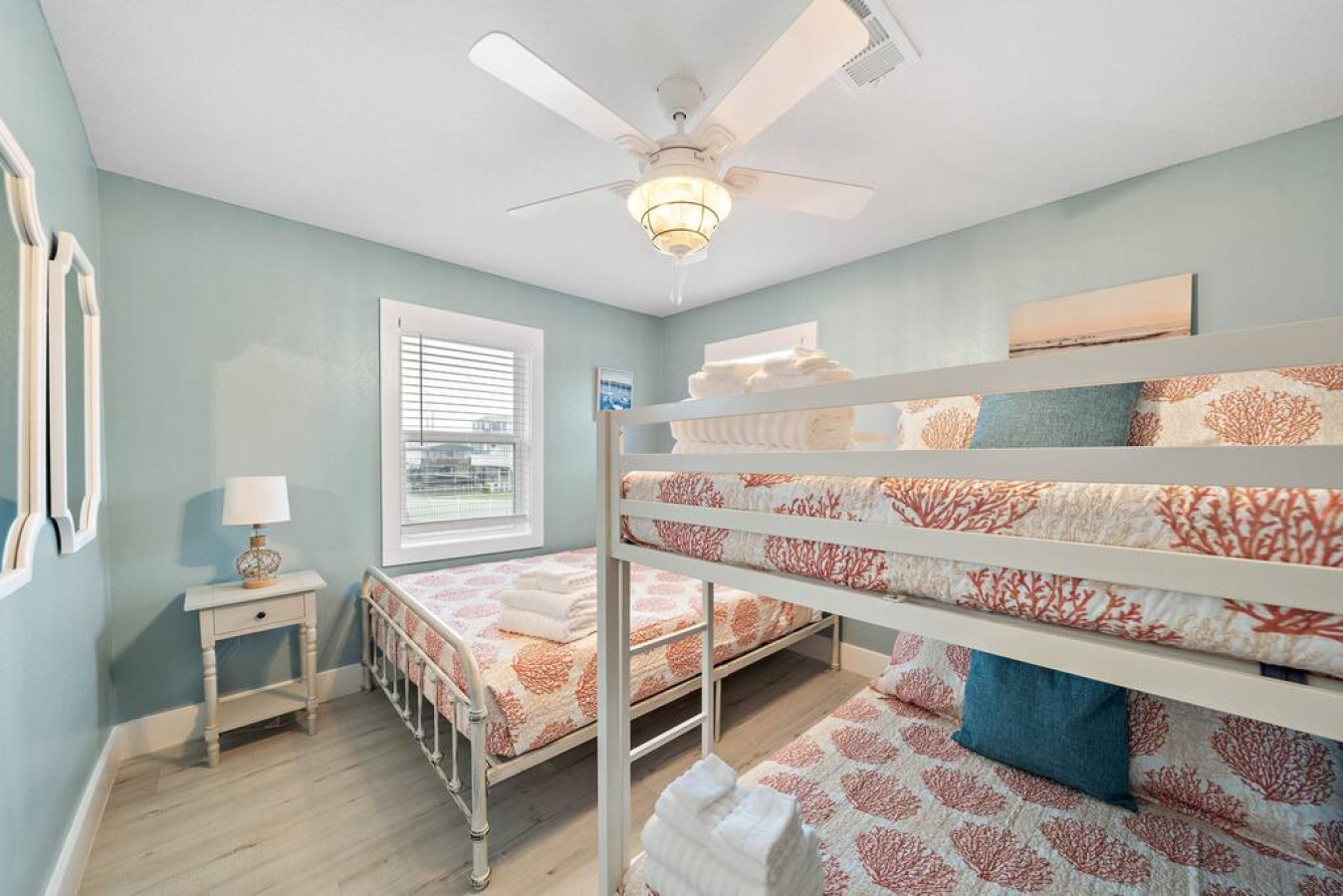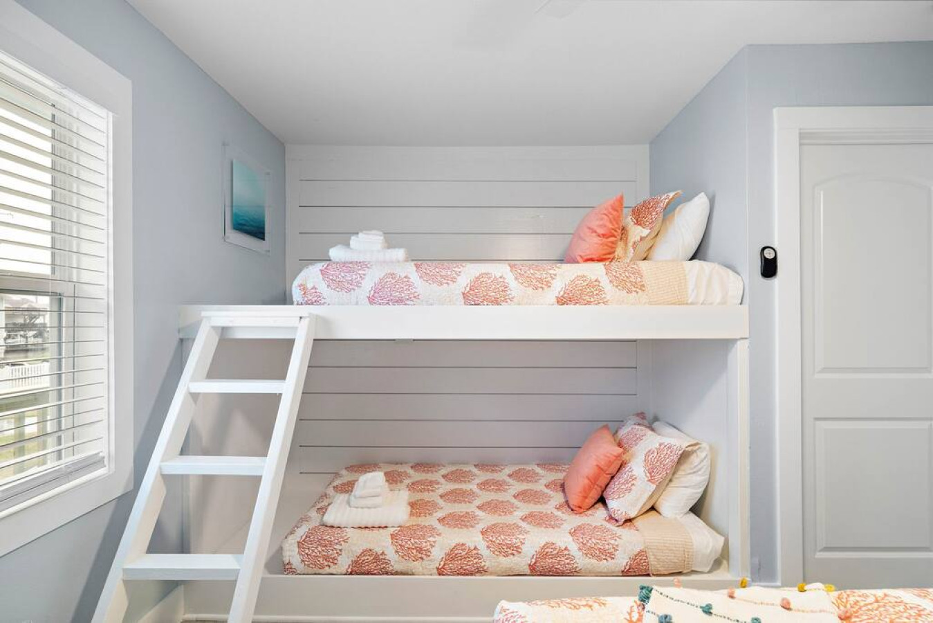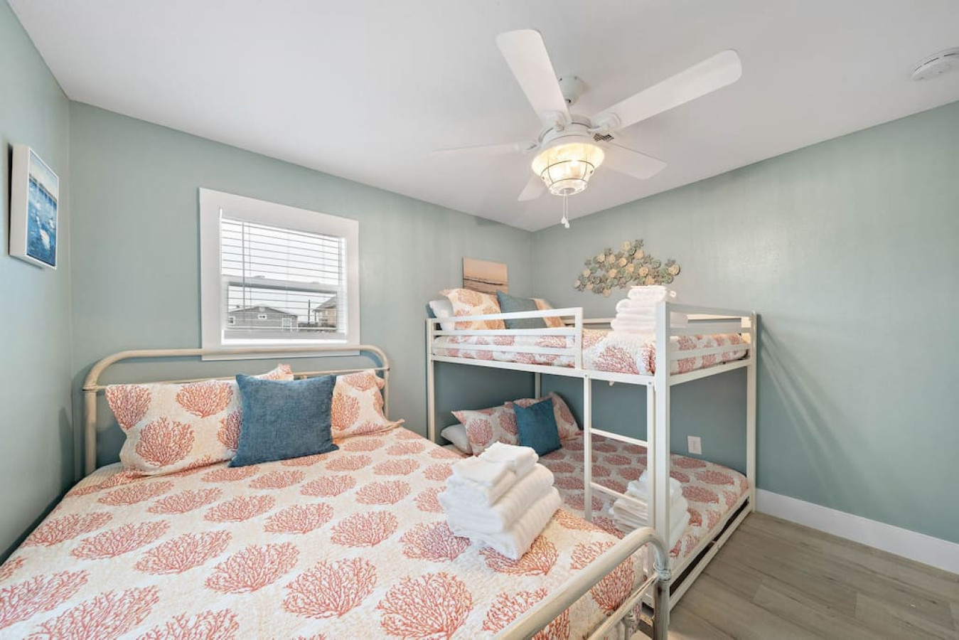 Temptations at Bay boasts comfortable sleeping arrangements for your Galveston getaway. One room features a luxurious king-sized bed, while the other two bedrooms offer flexibility. One room has a queen-sized bed with a built-in twin-over-twin bunk bed, ideal for a family with young children. The other room features a queen-sized bed and a full-over-full bunk bed, providing ample space for additional guests. With two full bathrooms, everyone will have plenty of space to get ready for a day of exploring Galveston or unwinding after a fun-filled day at the beach.