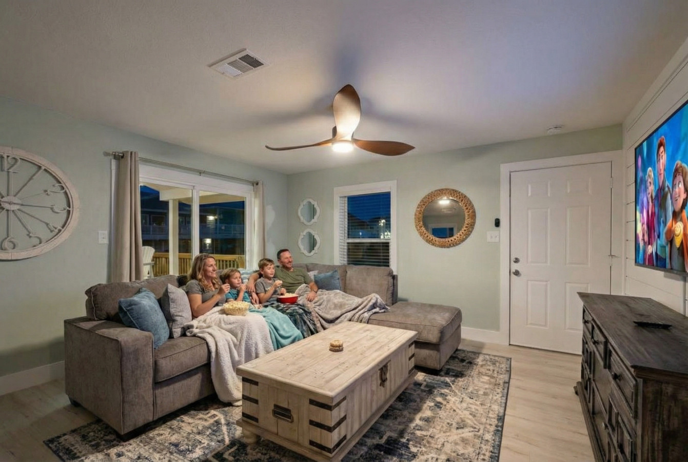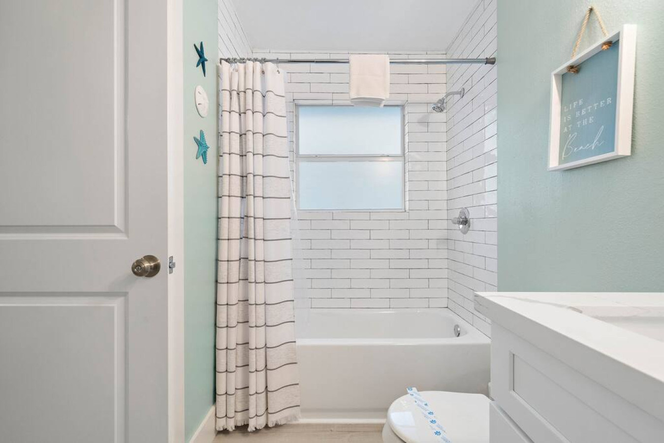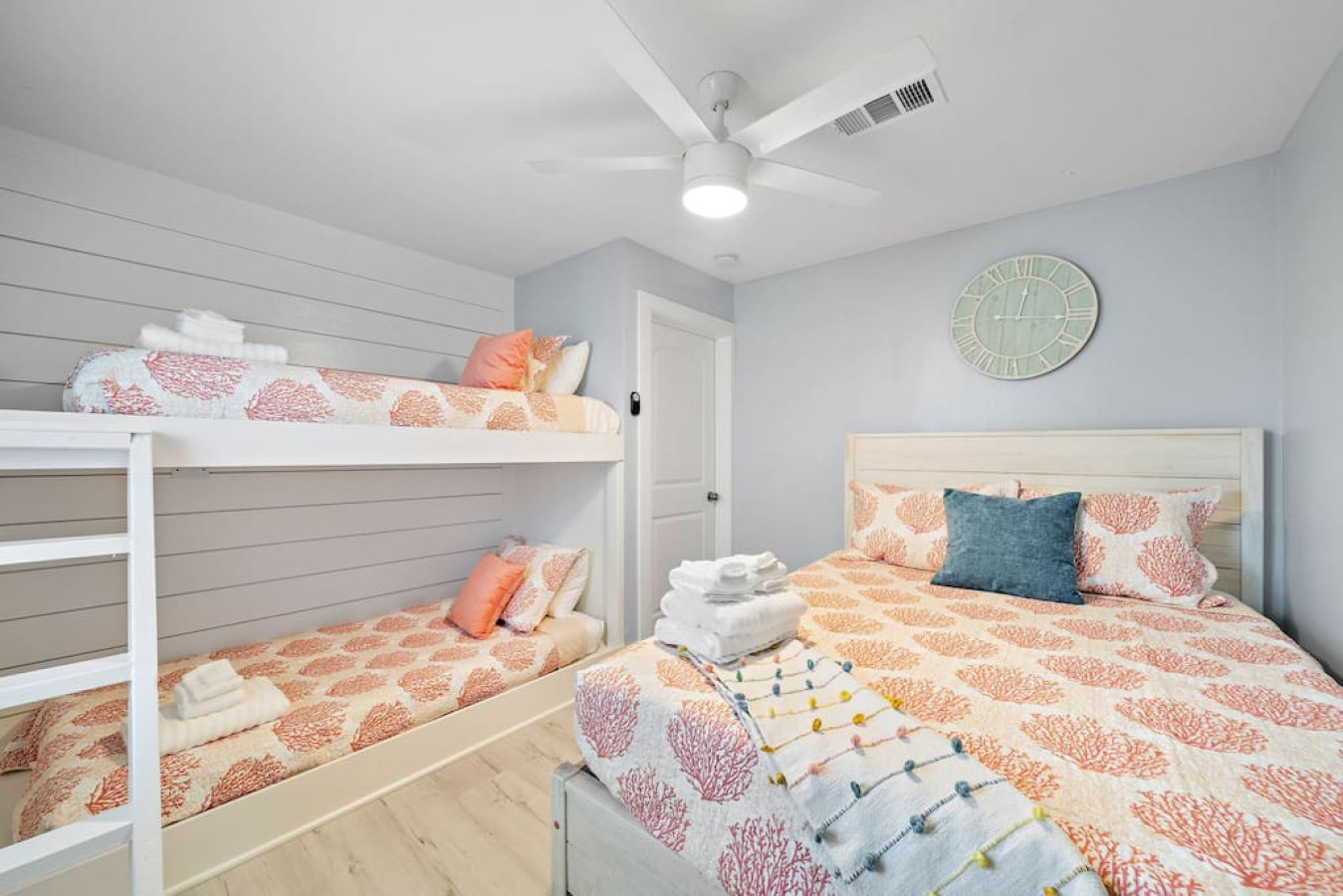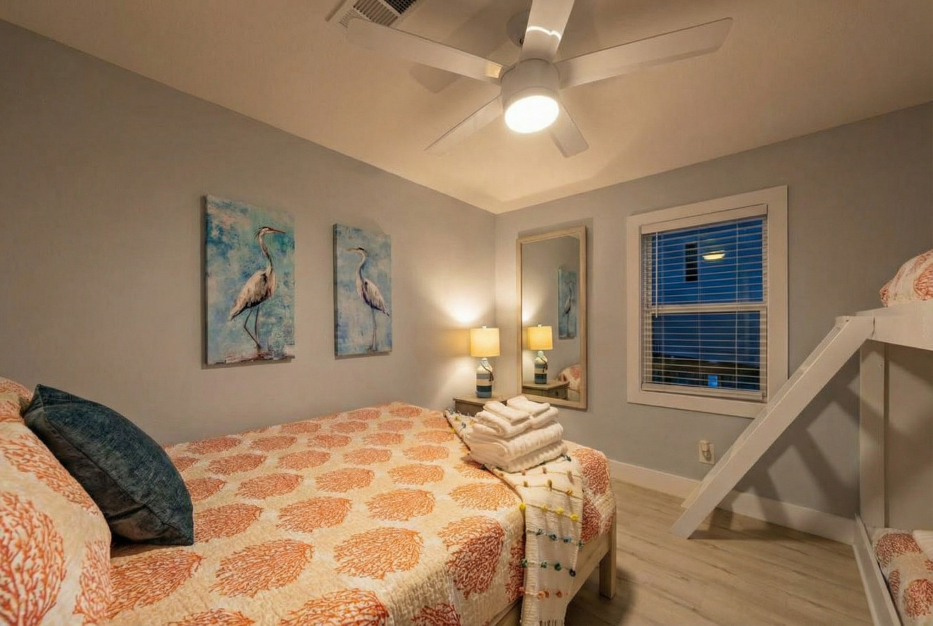 Temptations at Bay boasts comfortable sleeping arrangements for your Galveston getaway. One room features a luxurious king-sized bed, while the other two bedrooms offer flexibility. One room has a queen-sized bed with a built-in twin-over-twin bunk bed, ideal for a family with young children. The other room features a queen-sized bed and a full-over-full bunk bed, providing ample space for additional guests. With two full bathrooms, everyone will have plenty of space to get ready for a day of exploring Galveston or unwinding after a fun-filled day at the beach.