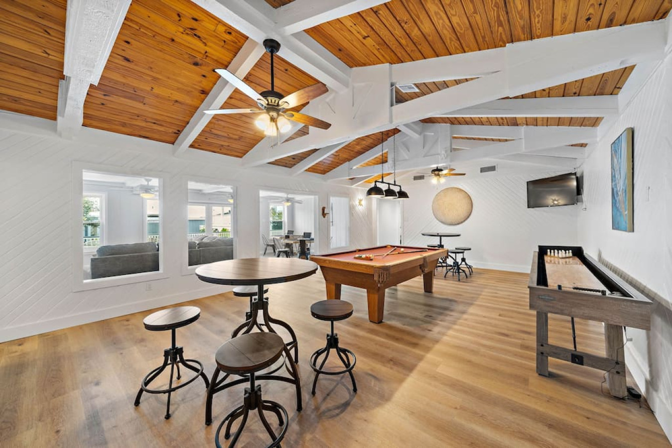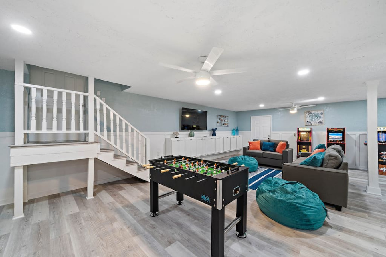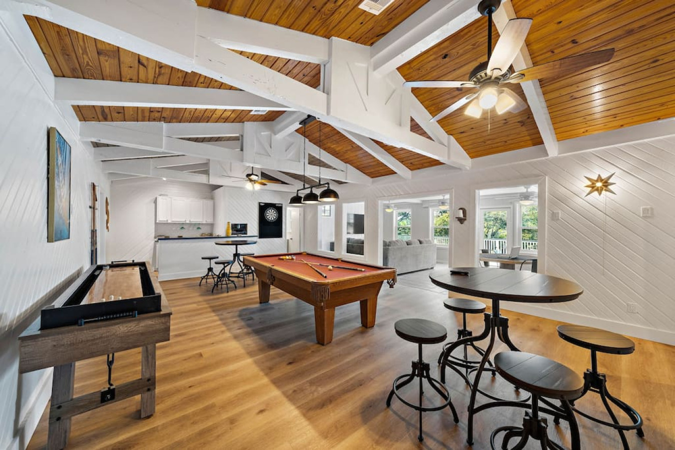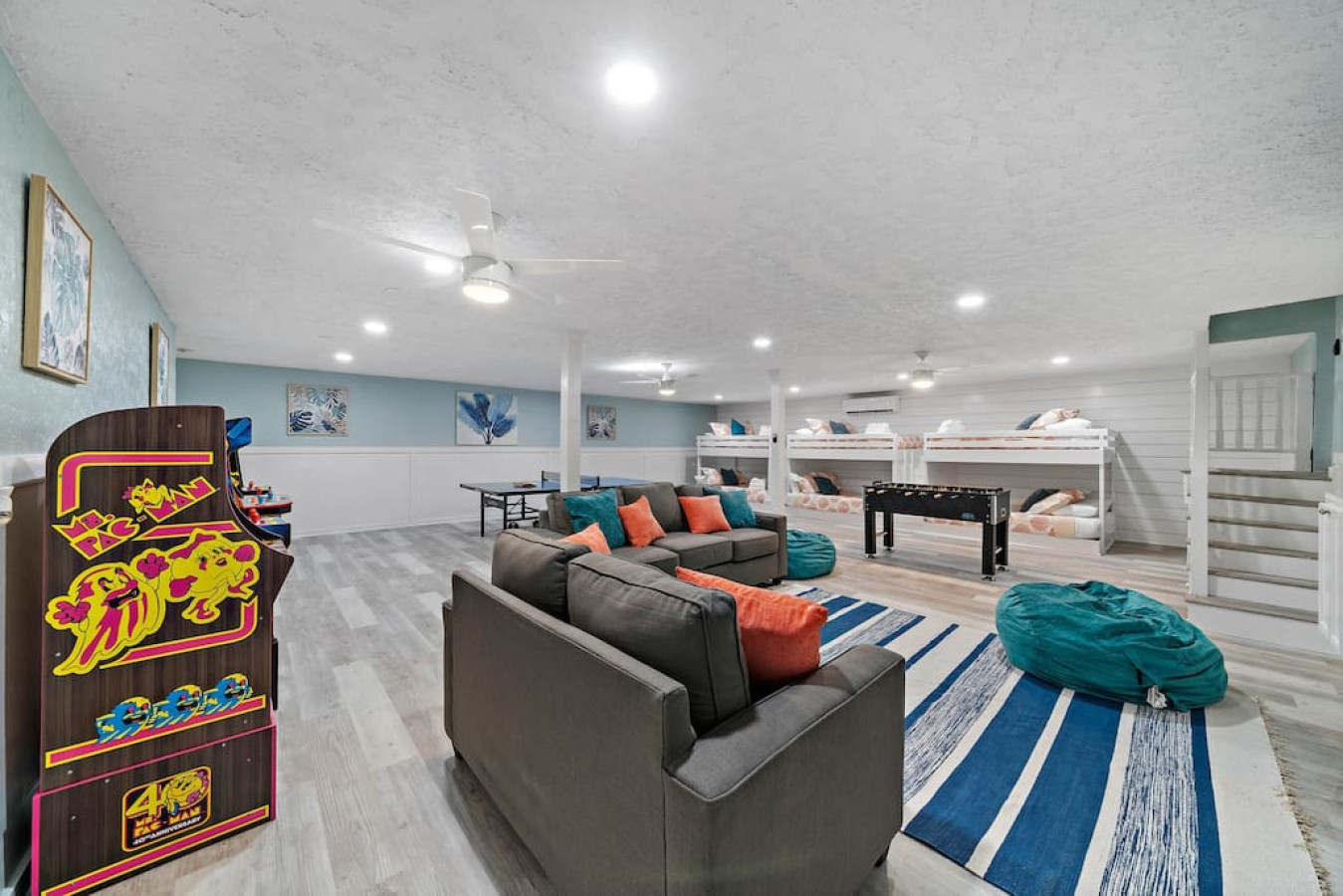 Enjoy quality time with loved ones in the fenced yard, take a dip in the refreshing cowboy pool, or gather around the firepit for unforgettable evenings. Relax on the deck or unwind in one of the two living areas, complete with game rooms featuring poker tables, pool tables, shuffleboard, arcade games, and a ping pong table.