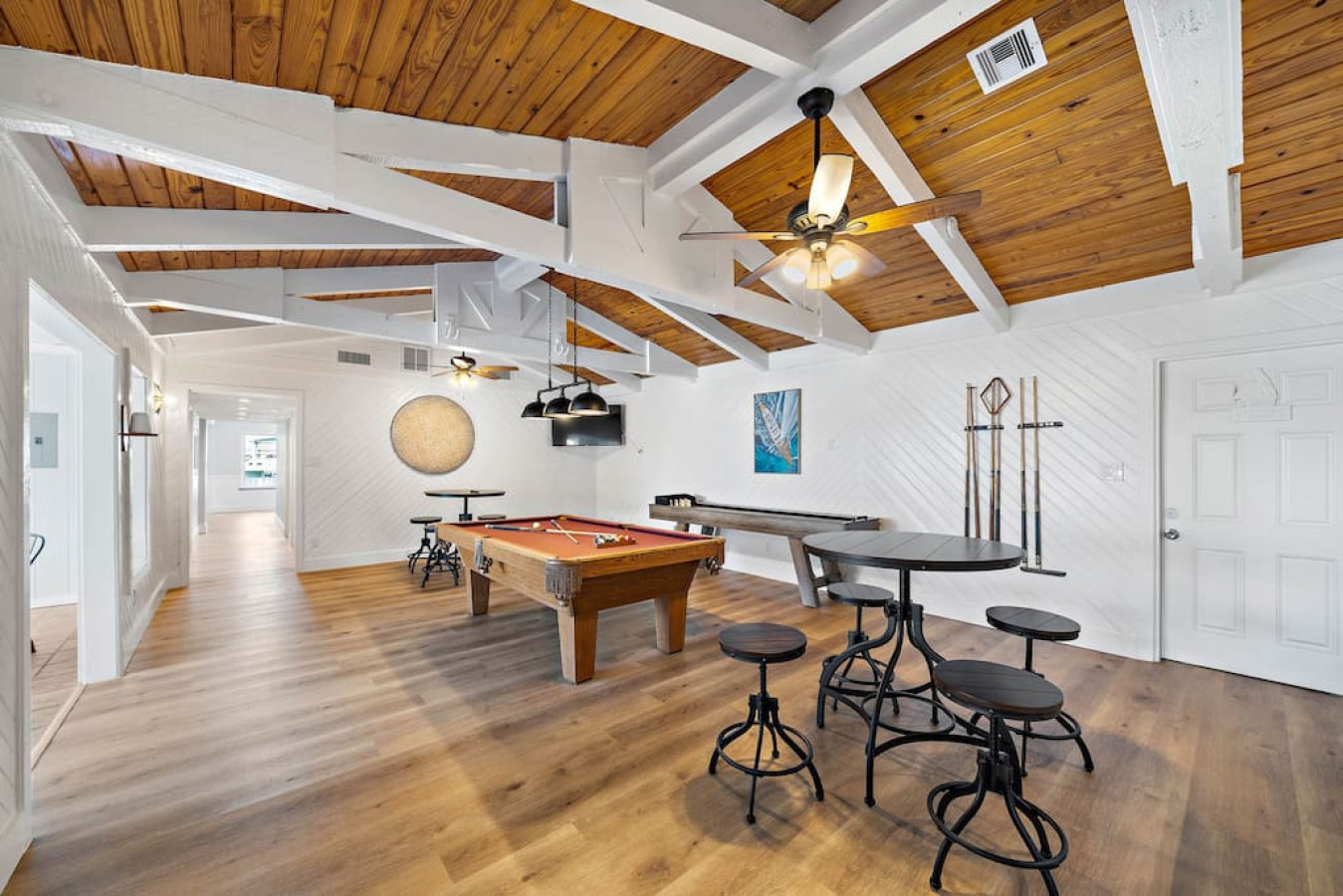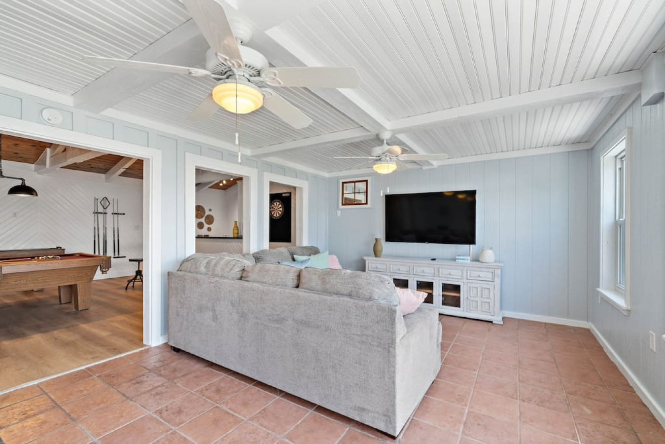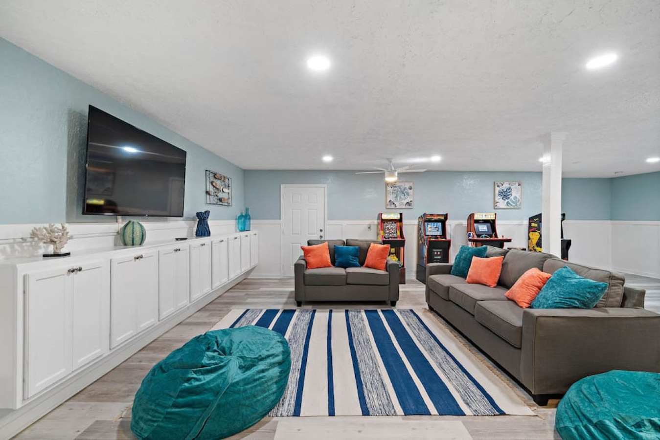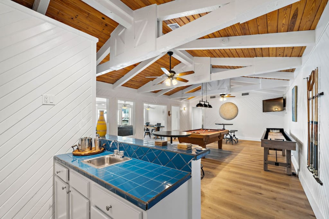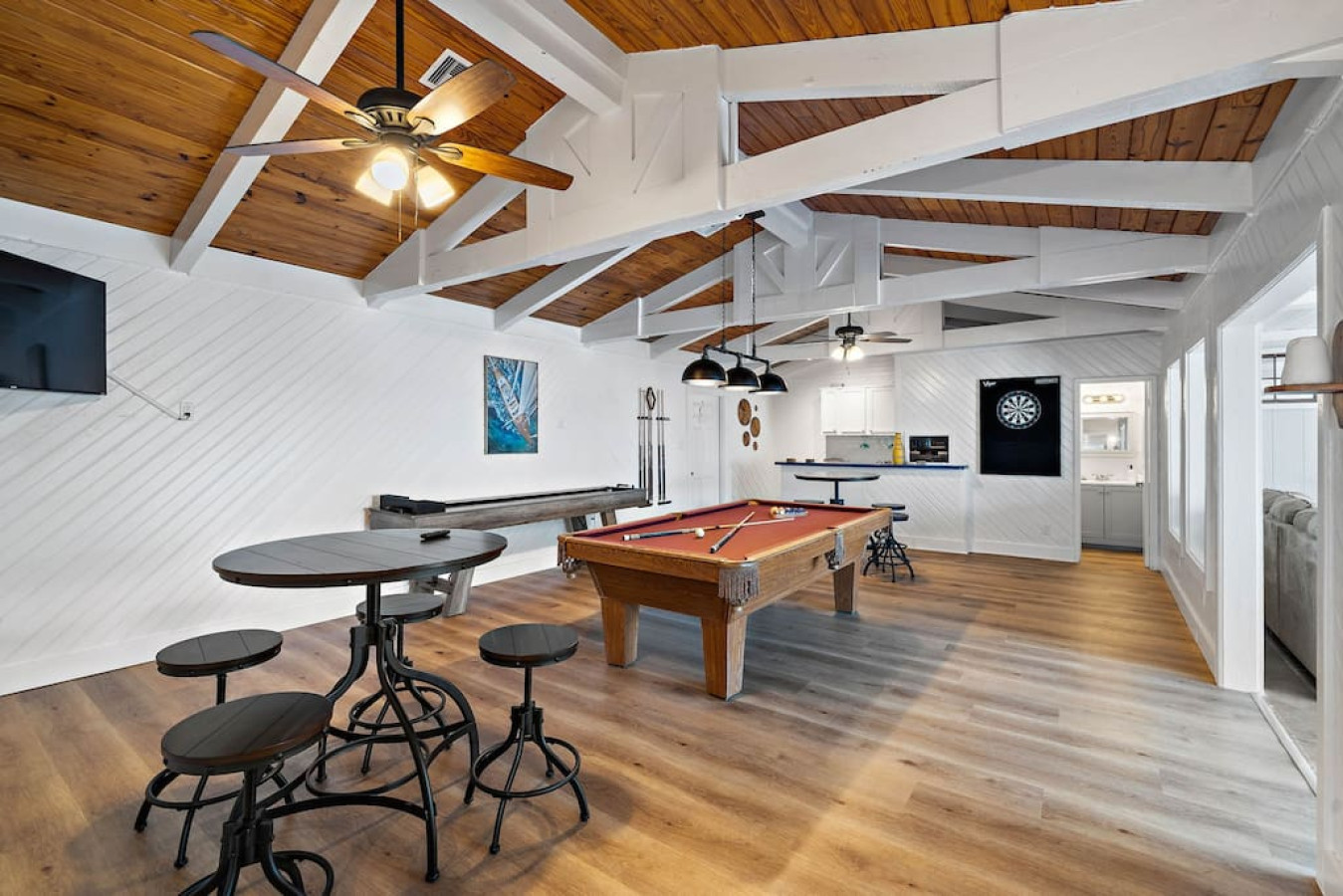 Enjoy quality time with loved ones in the fenced yard, take a dip in the refreshing cowboy pool, or gather around the firepit for unforgettable evenings. Relax on the deck or unwind in one of the two living areas, complete with game rooms featuring poker tables, pool tables, shuffleboard, arcade games, and a ping pong table.