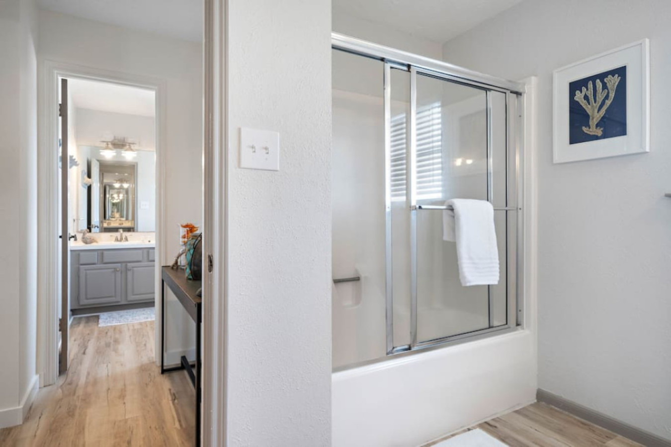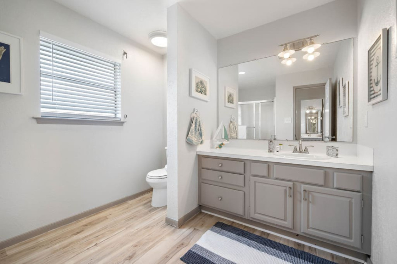 “The home was in a great location. The community is very nice and an easy walk to the beach. This house has so many beds and bathrooms, great for large groups. The kitchen is nice as well and there is a large dining room table. The beds were super comfortable too. Unfortunately the house had four tvs and none of them worked. We talked with management, they were very responsive, although we were never able to get them to work. Other than the television situation, which was definitely disappointing, our time at the house was very nice.”