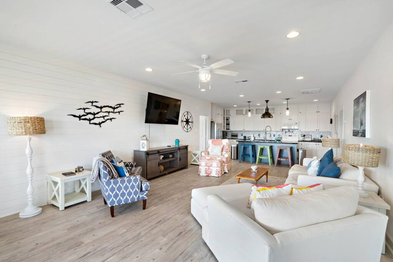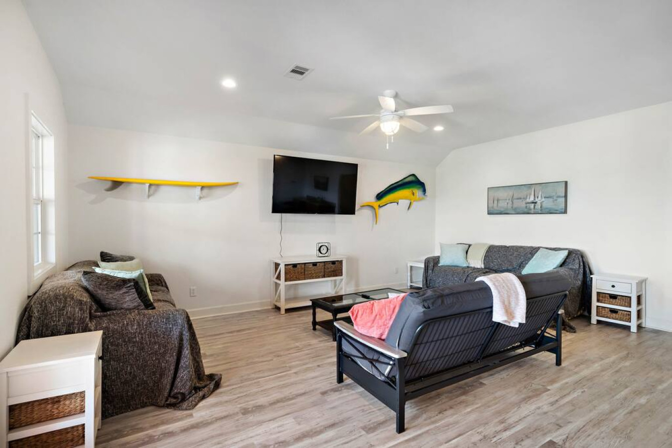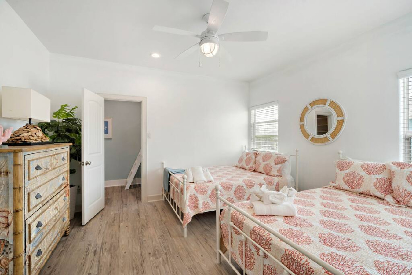 Unpack your flip flops at The Walloping Whale. This sprawling Surfside escape boasts 6 bedrooms and 3,500 square feet of coastal comfort, perfect for family reunions or epic friend-cations. Best part: You're just a quick 2-minute drive from sinking your toes into the warm sand. Grill up a feast on the expansive porch, unwind under the Texas sky on the huge deck, and let the sound of crashing waves lull you into relaxation. The Walloping Whale is your beachside haven for unforgettable memories.