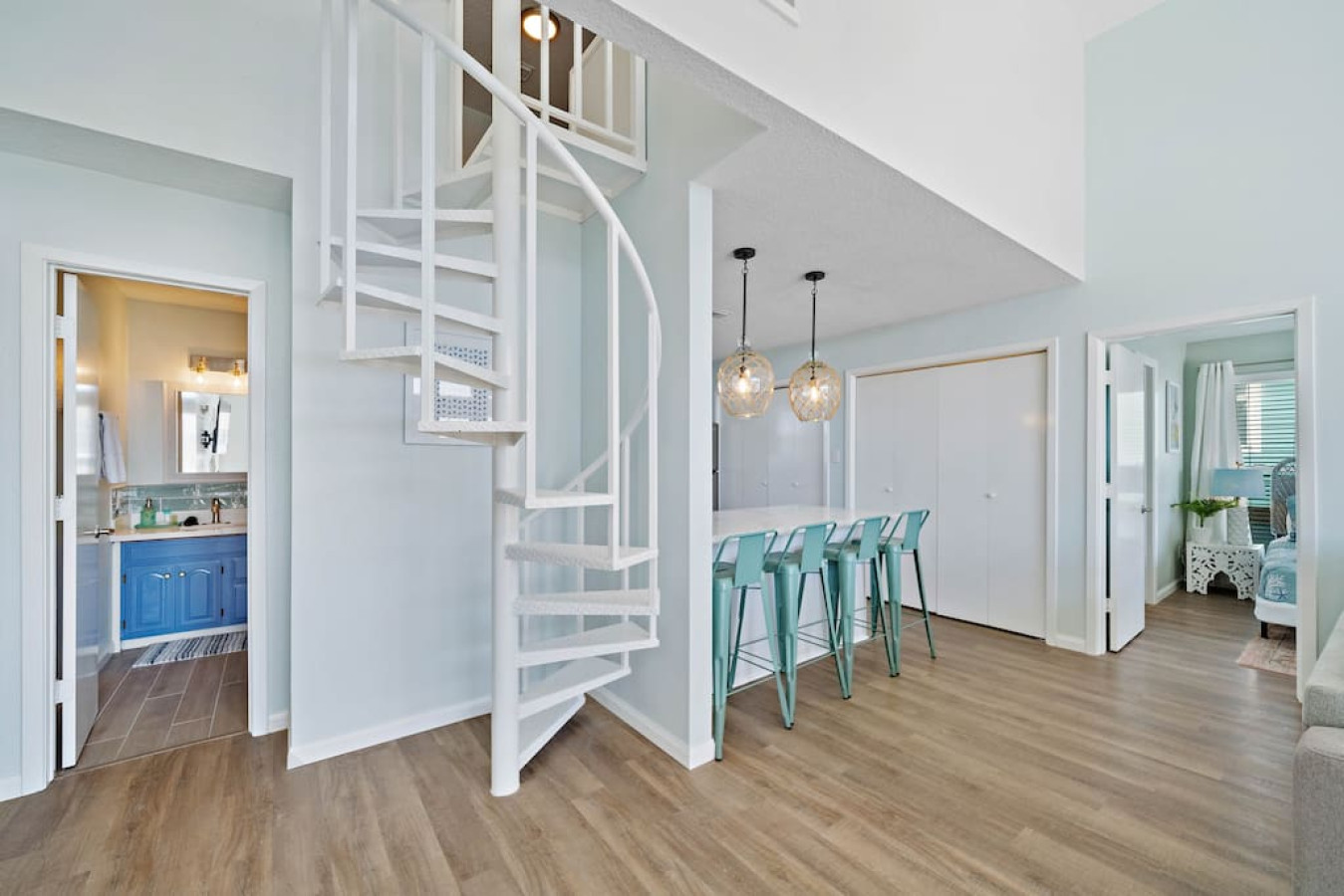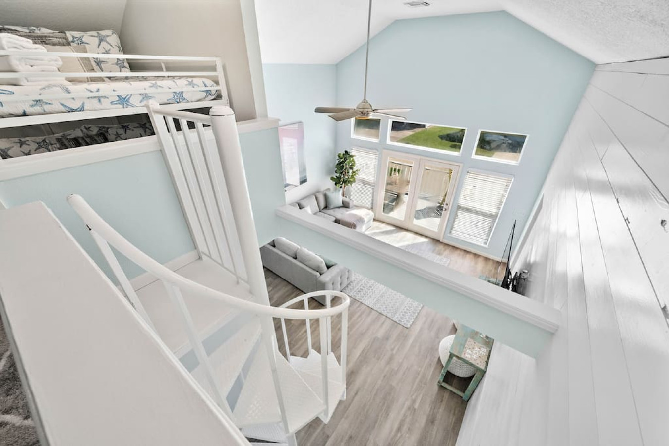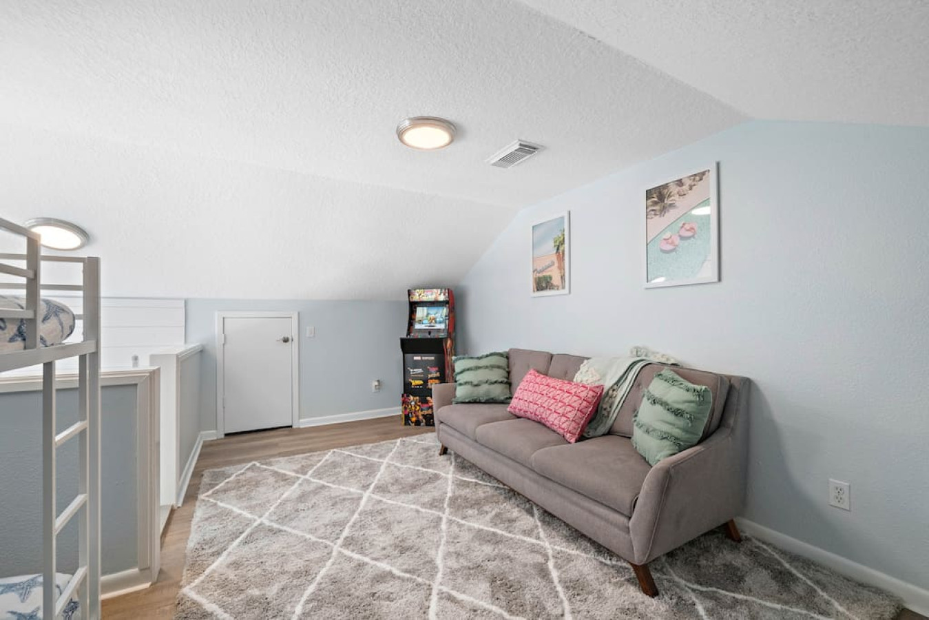 Head upstairs via the charming spiral staircase to discover a fun-filled loft area. This space features a comfy couch, an arcade game to keep everyone entertained, and a full-over-full bunk bed for additional sleeping arrangements.