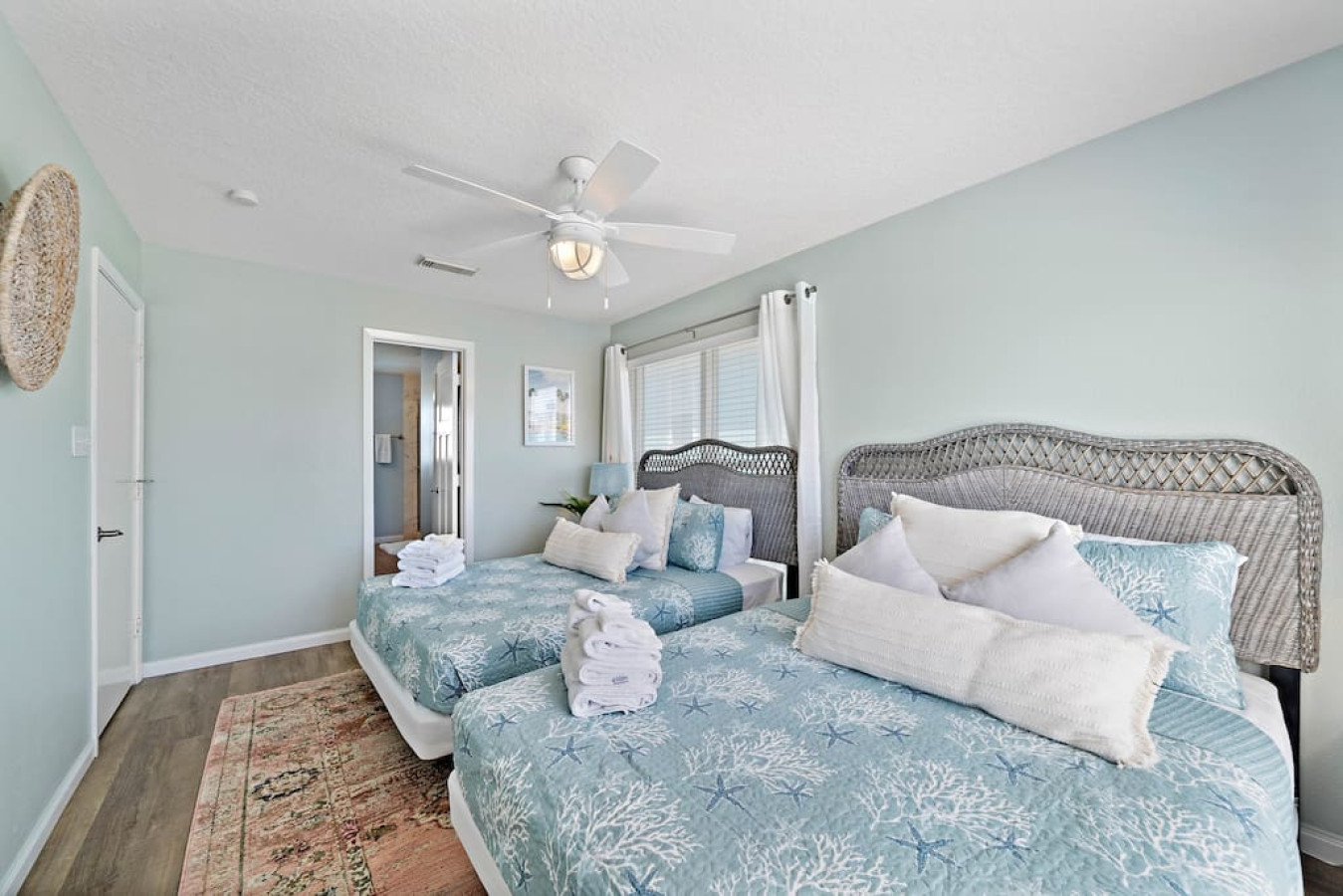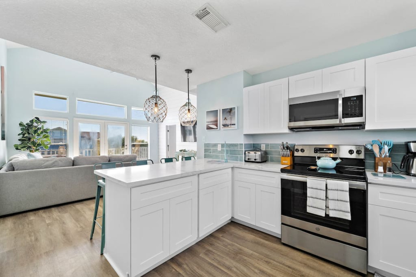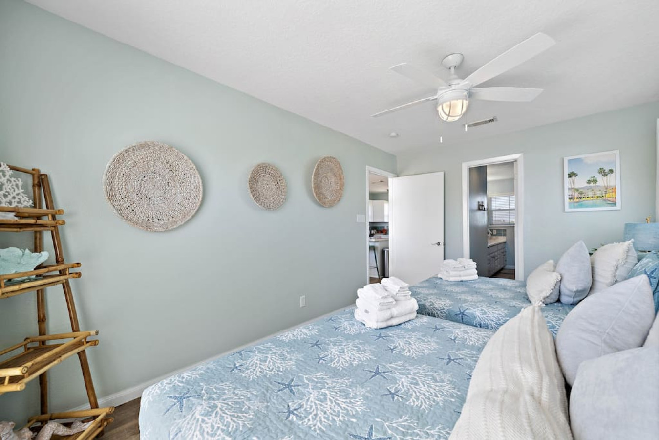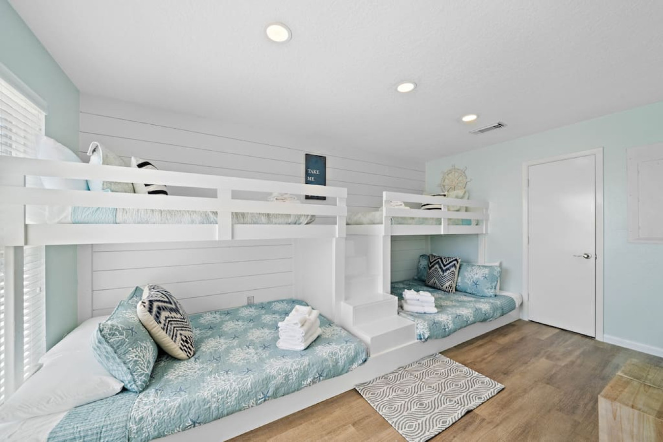 Inside, Villa La Isla welcomes you with an open-concept living area. The large windows bathe the space in natural light, creating a warm and inviting atmosphere. Settle in for movie nights on the big-screen TV in the living room, which flows seamlessly into the fully equipped kitchen with bar seating. Off the living area, you’ll find a bedroom with a plush king-sized bed, perfect for parents seeking a quiet retreat. Two additional bedrooms complete this level, one with two queen beds and another with two twin-over-full bunk beds.
